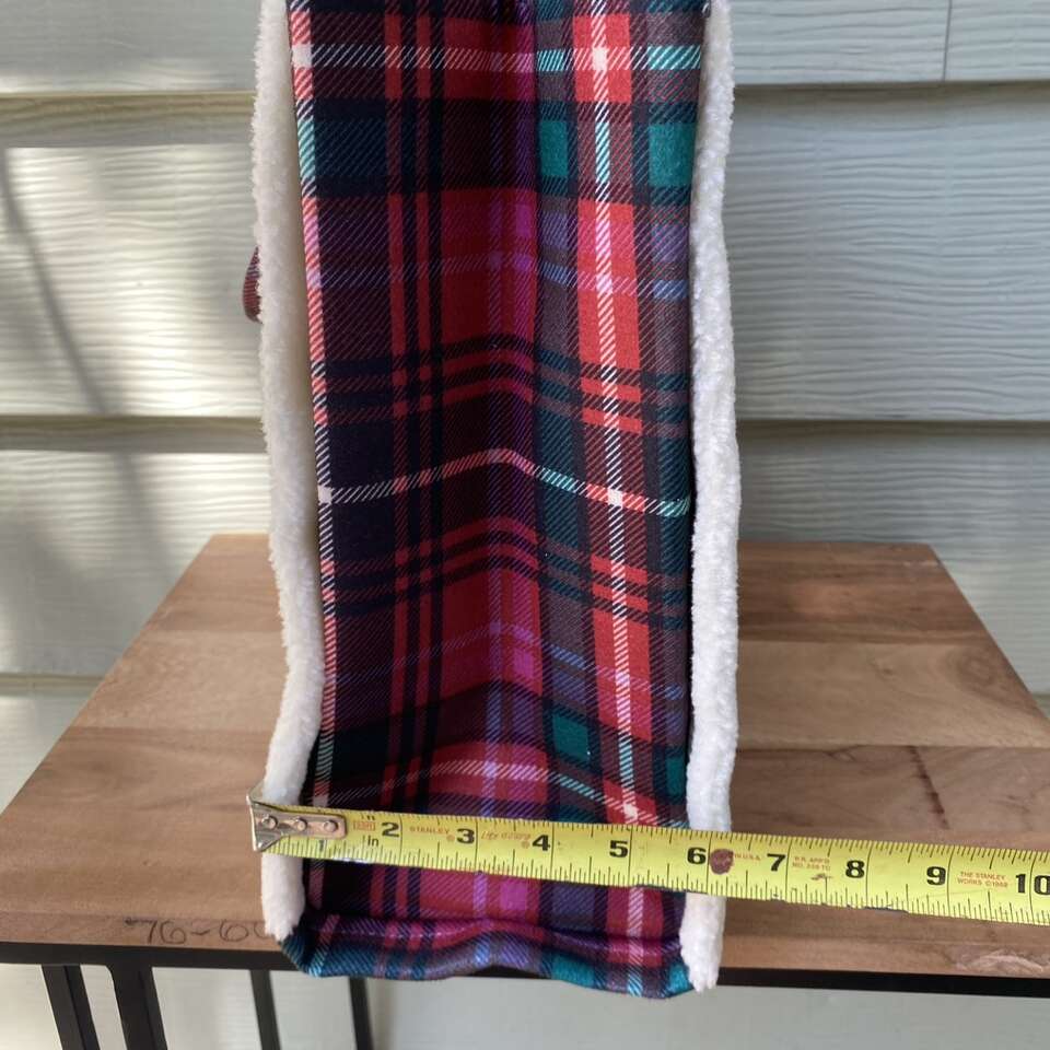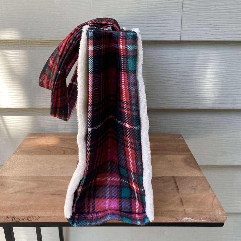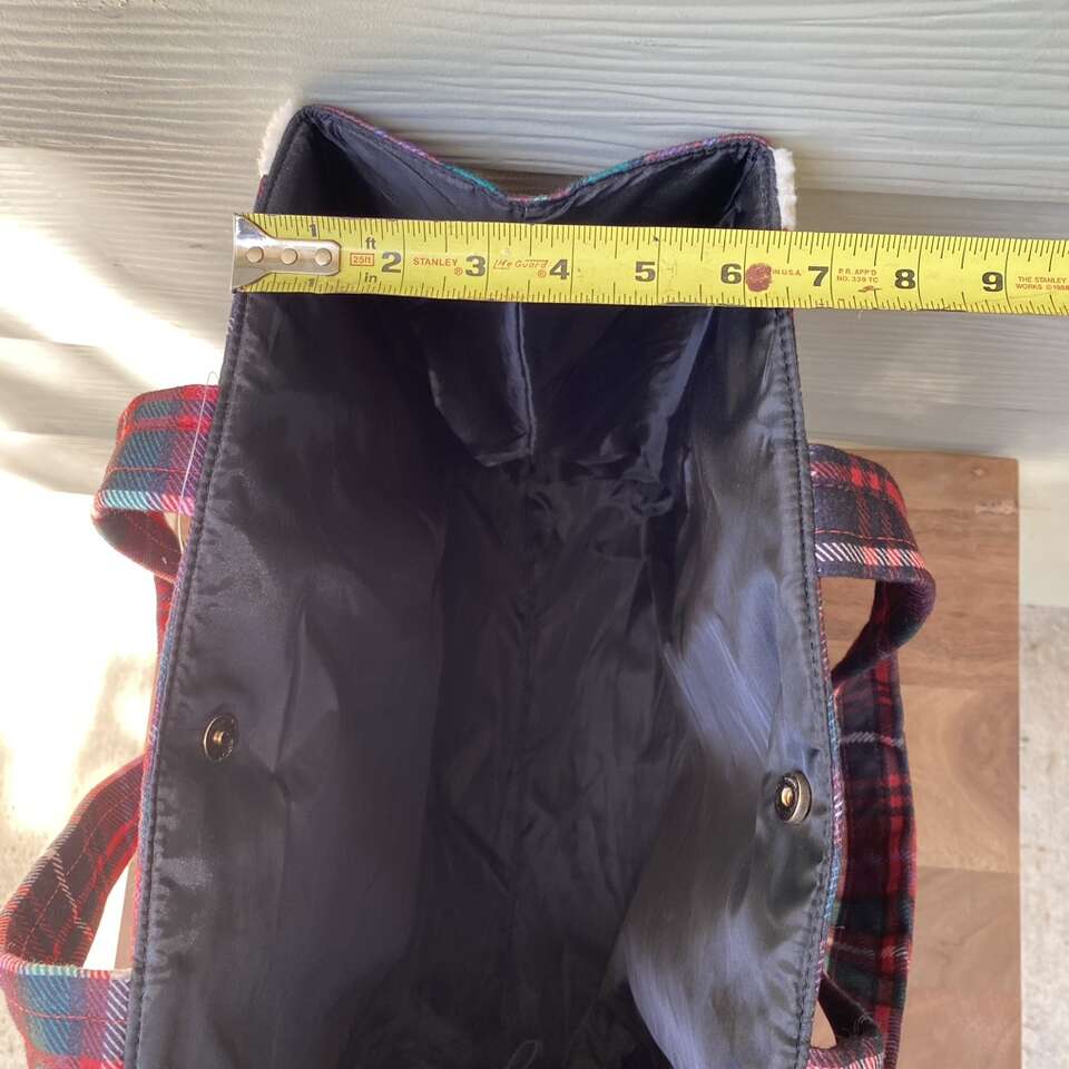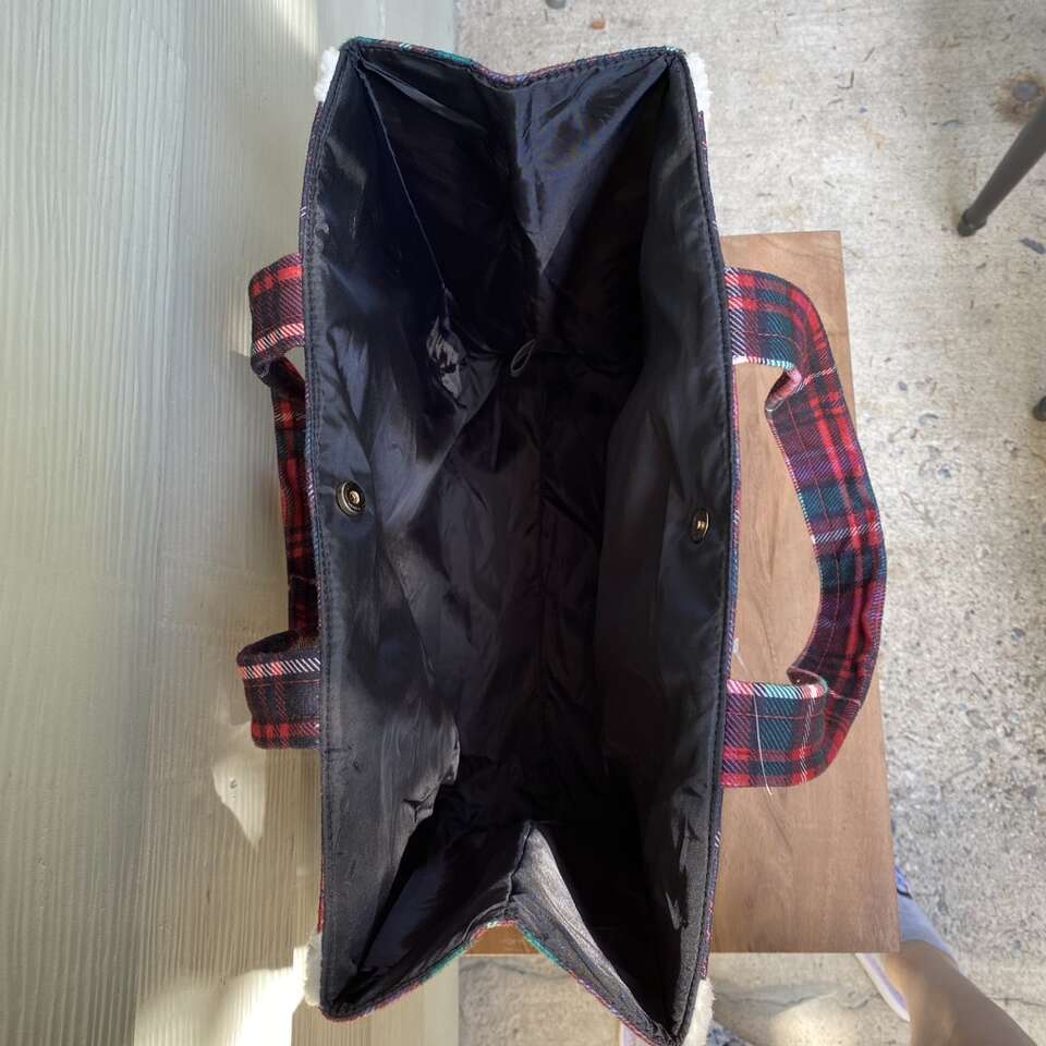 New Victoria Secret Tote Bag Cozy Sherpa trim plaid flannel material New with tags Snap closure See pictures for approximate measurements