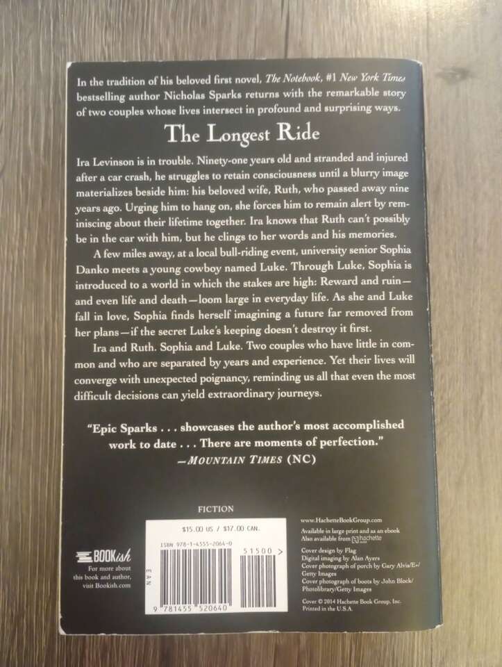 Used, paperback copy of 'The Longest Ride' by Nicholas Sparks. This is a really good book. In fair-good condition, has some normal wear but still in decent shape. Smoke-free home. $4 cash or Venmo. Will hold with Venmo. Text if interested. Feel free to check out my other ads-lots for sale including lots of books.