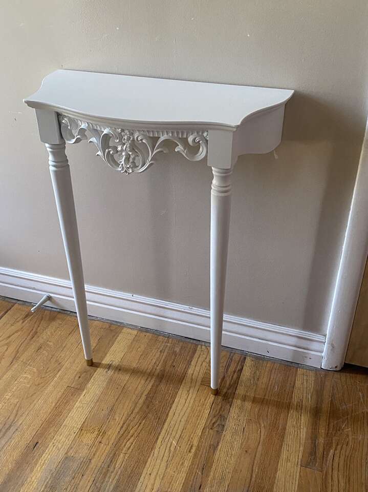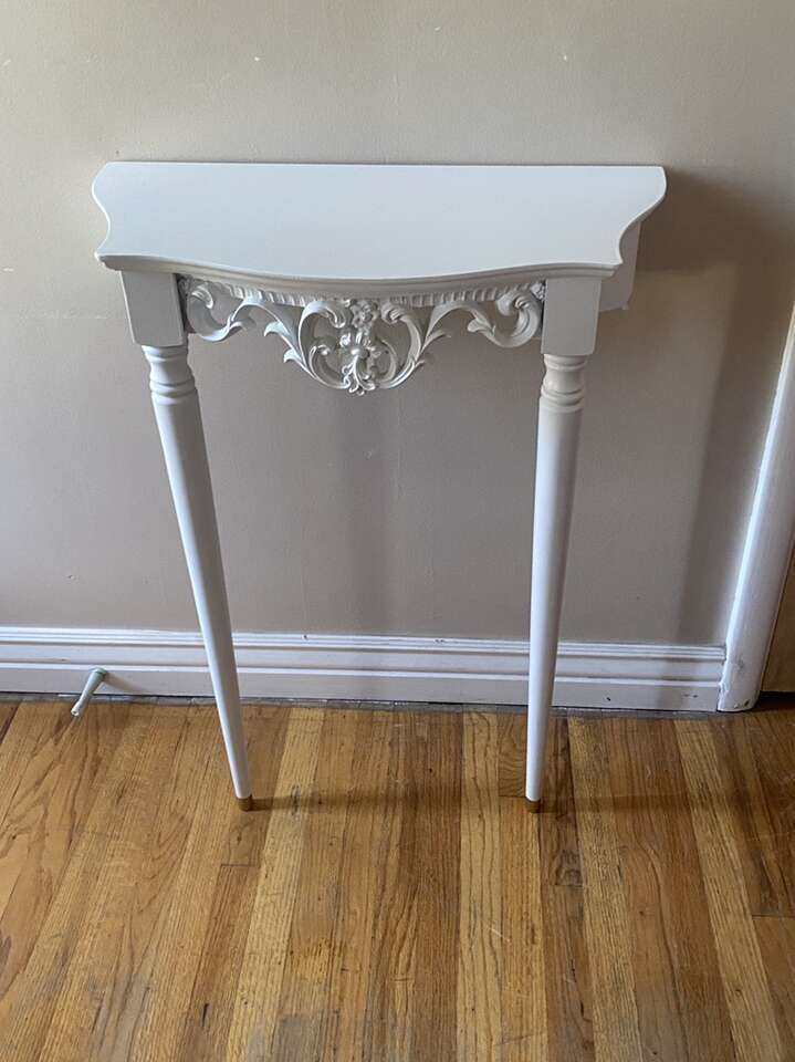 White with brass feet. Great accent piece for your entry, hall, or any room! Just mount to the wall and style with a great accent mirror!