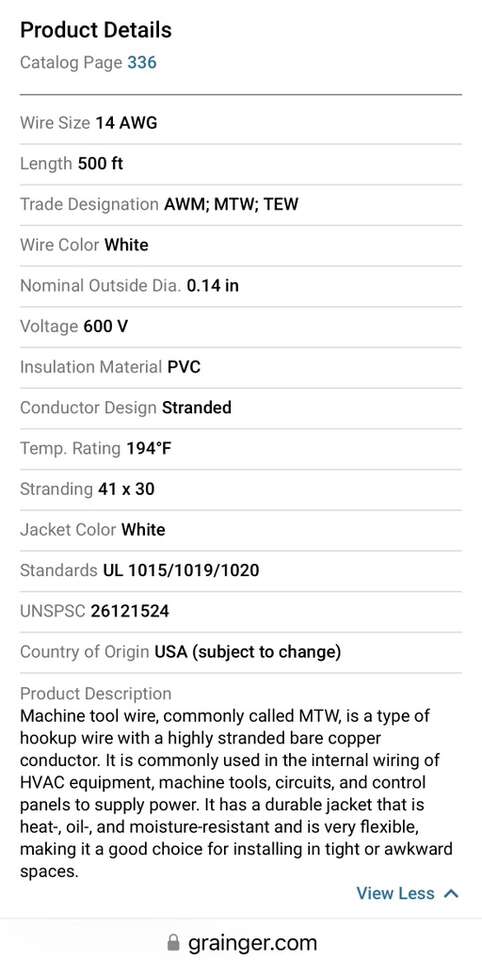 Description- 500’ Roll of MTW 14–41 stranded machine tool/building wire with white insulation. Also suitable for wet dry boat/marine cable. See photos for more product information and specifications.