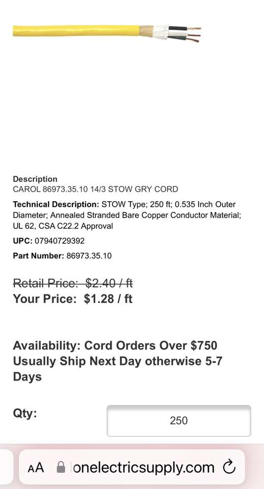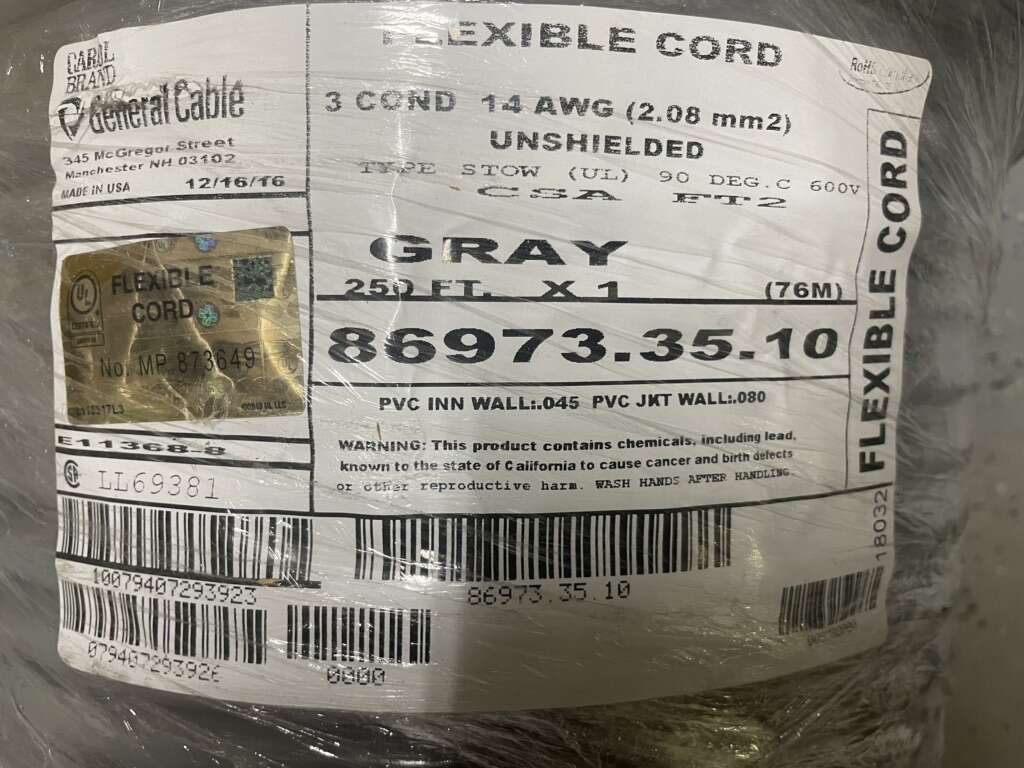 Description- 250’ Spool of 14/3 STOW cable in gray. 3-Conductor, 14AWG, unshielded wire. See photos for more product information and specifications.