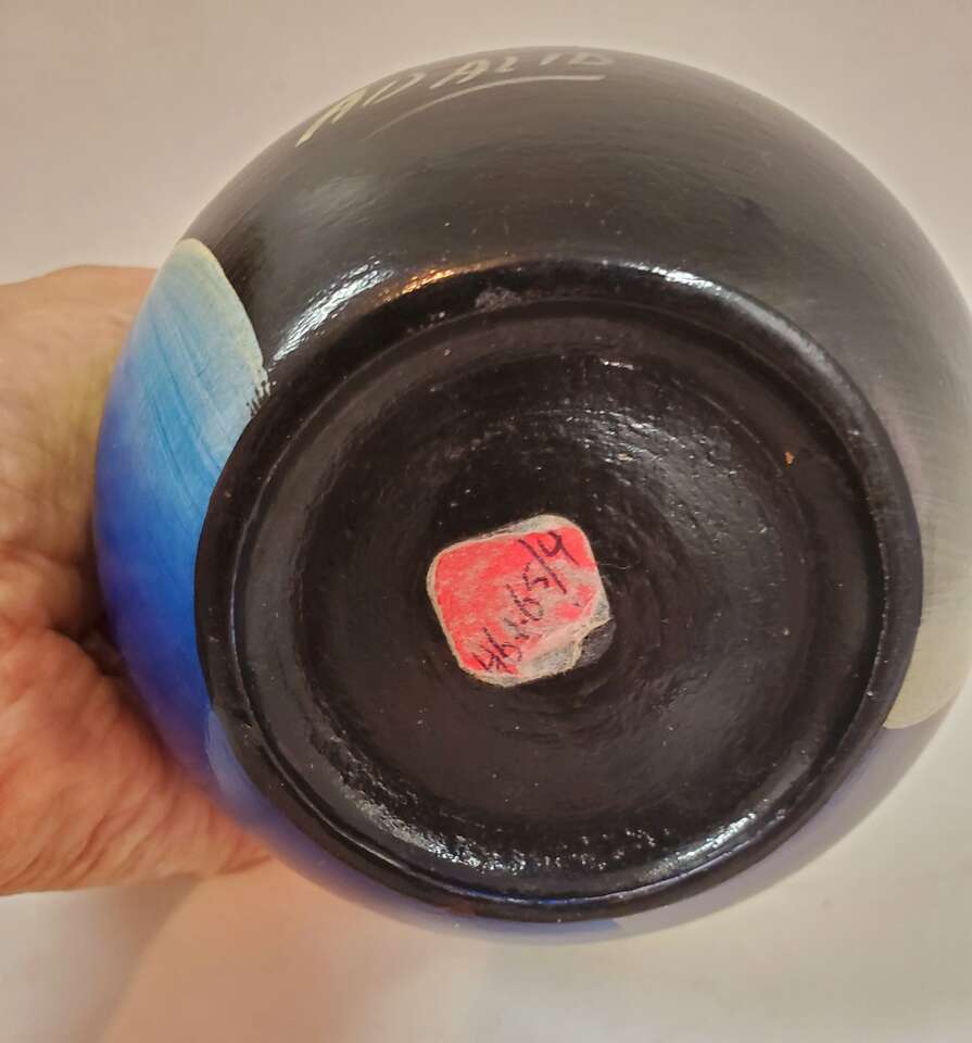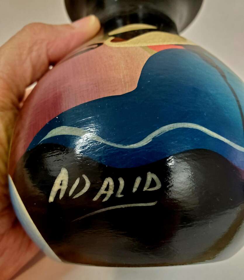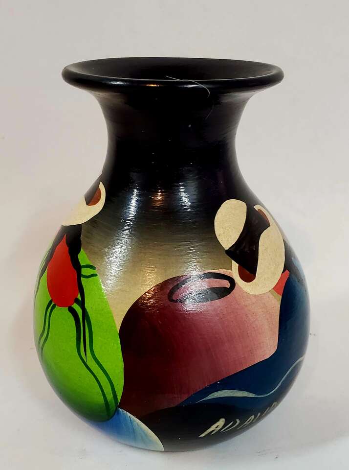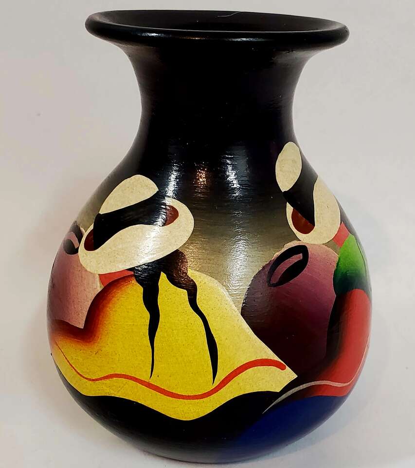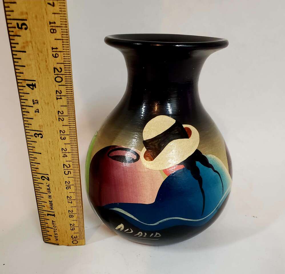 South America Hand Painted Art Pottery Vase Signed By Equadorian Artisan Adalid. Wheel Thrown Red Clay Pottery Beautiful Hand Painted Vibrant Colors. Native Folk Women in Shawls White Straw Hats and Braided Hair Sitting Next to Pottery. Painted in the Style of Tarsila Do Amaral, a beloved Brazilian Artist. Approximately 5" X 4". Cash Only, no Codes.
