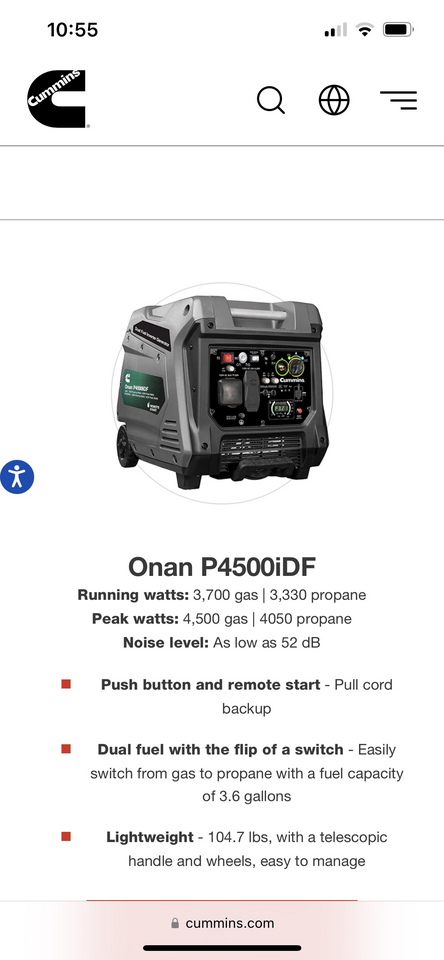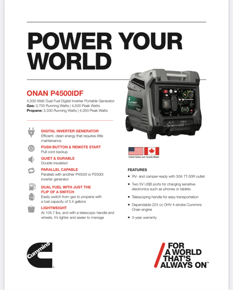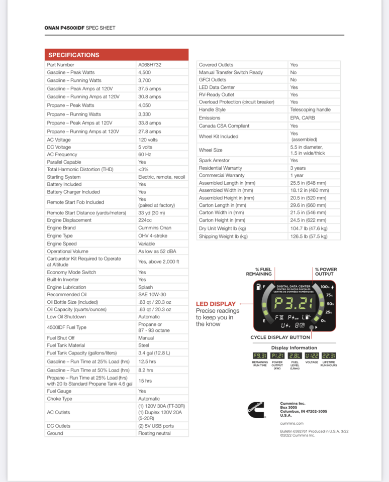 Running watts: 3,700 gas | 3,330 propane Peak watts: 4,500 gas | 4050 propane **Noise level: **As low as 52 dB