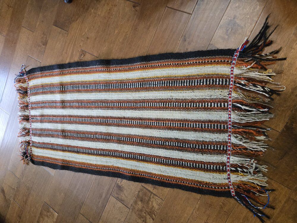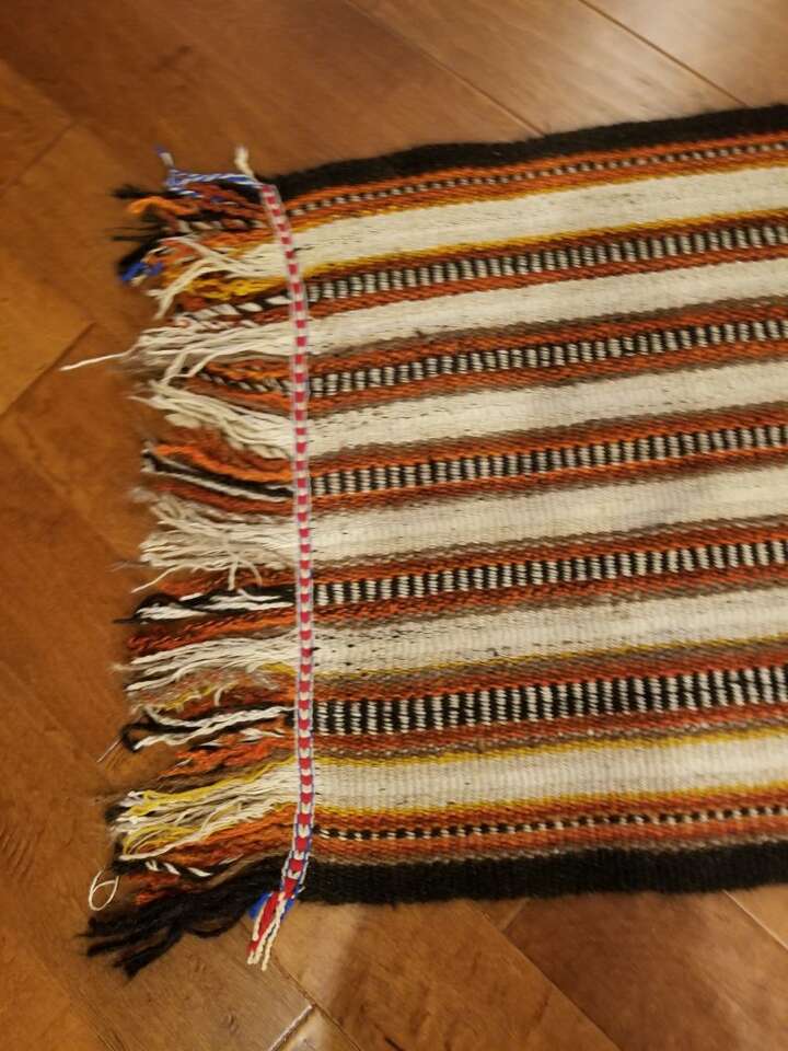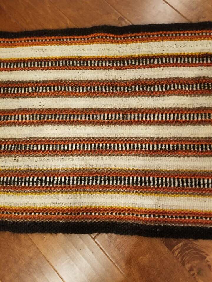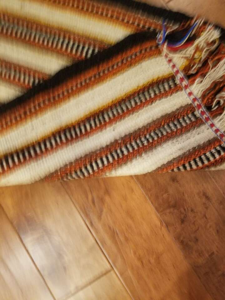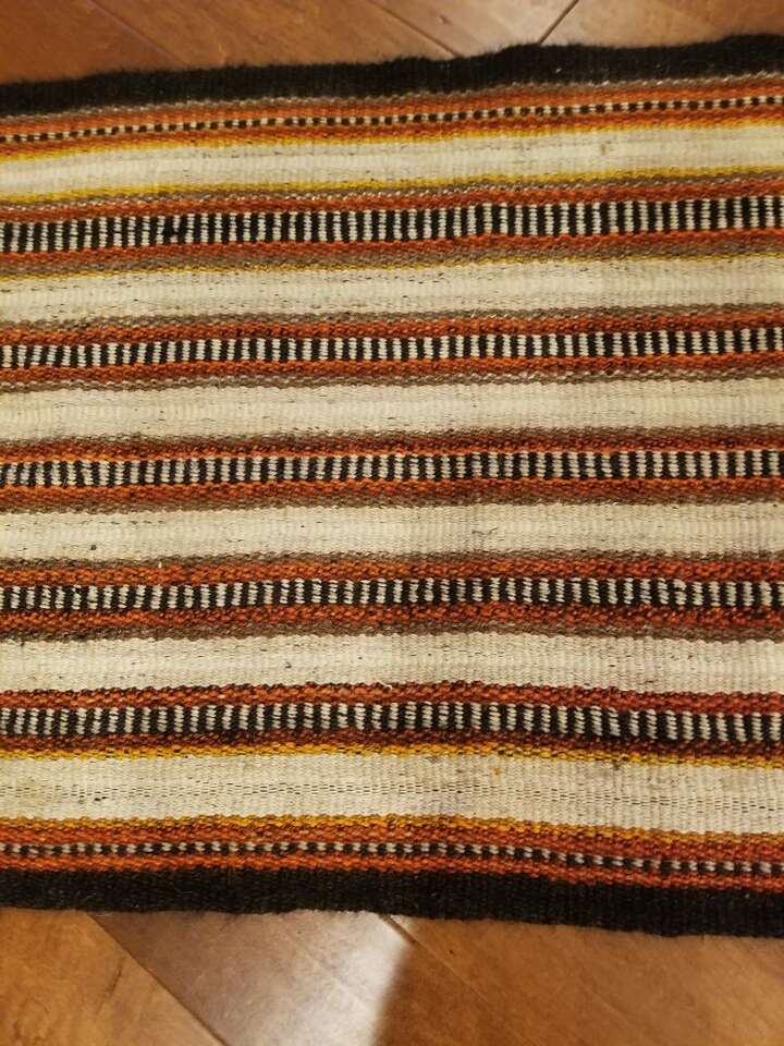 This colorful kilim carpet is from the Middle East and is handmade of 100% wool. It measures 2.5 feet wide X 4.8 feet long, and is 3/8 inch thick. It is soft to the touch. It is beige with brown, black, two shades of orange and has long fringe on both ends. NEW, never been used, has been rolled up in an air conditioned room. Our home is pet free and smoke free. It would look wonderful on a wall, table, the back of a sofa, or on the floor. Beautiful carpet. Just reduced price by $90. And reduced price by $25 more. And reduced another $10. Just reduced price again.