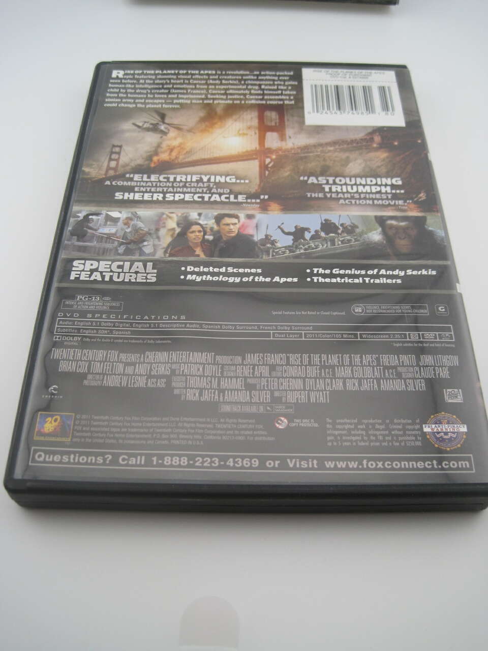 Rise of the Planet of the Apes 2011 - DVD - A single act of both compassion and arrogance leads to a war unlike any other - and to the RISE OF THE PLANET OF THE APES. The Oscar-winning visual effects team that brought to life the worlds of Avatar and Lord of the Rings is breaking new ground, creating a CGI ape that delivers a dramatic performance of unprecedented emotion and intelligence, and epic battles on which rest the upended destinies of man and primate. Rated PG-13 for intense and frightening sequences of action and violence.