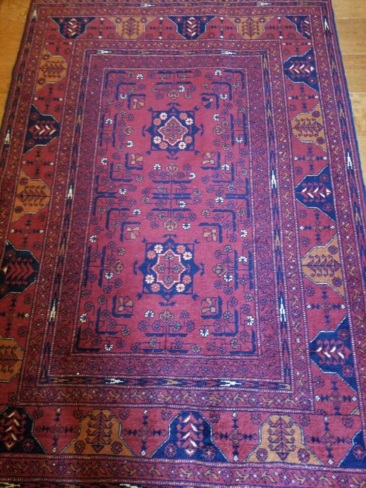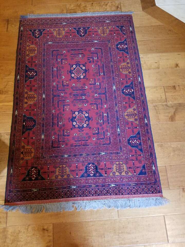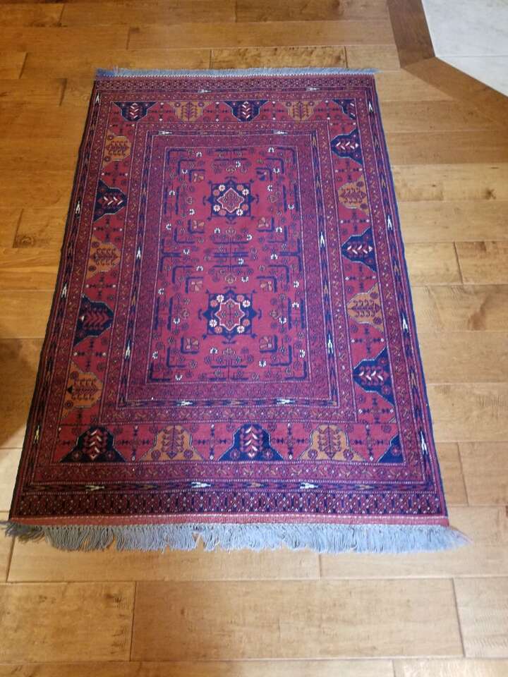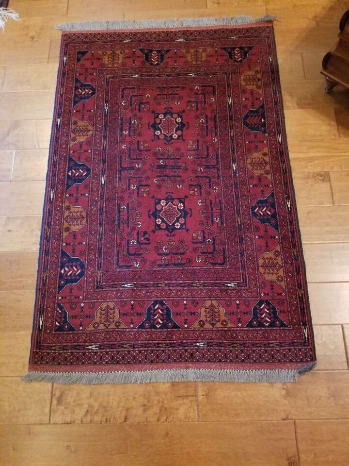 This red carpet is made by Khal Mohammadi and is hand knotted by the finest weavers from 100% high quality wool ensuring long wearing durability. Design is symmetrical and well balanced with central medallion and a repeated pattern dominating the carpet. Size is 5 feet long and 3.4 feet wide. These carpets are the most popular oriental rugs worldwide. In excellent condition.