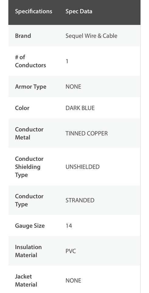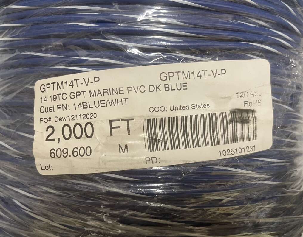 Description- 2000’ Spool of 14 AWG 19 Strand marine grade primary wire in blue/white. See photos for more product information and specifications.
