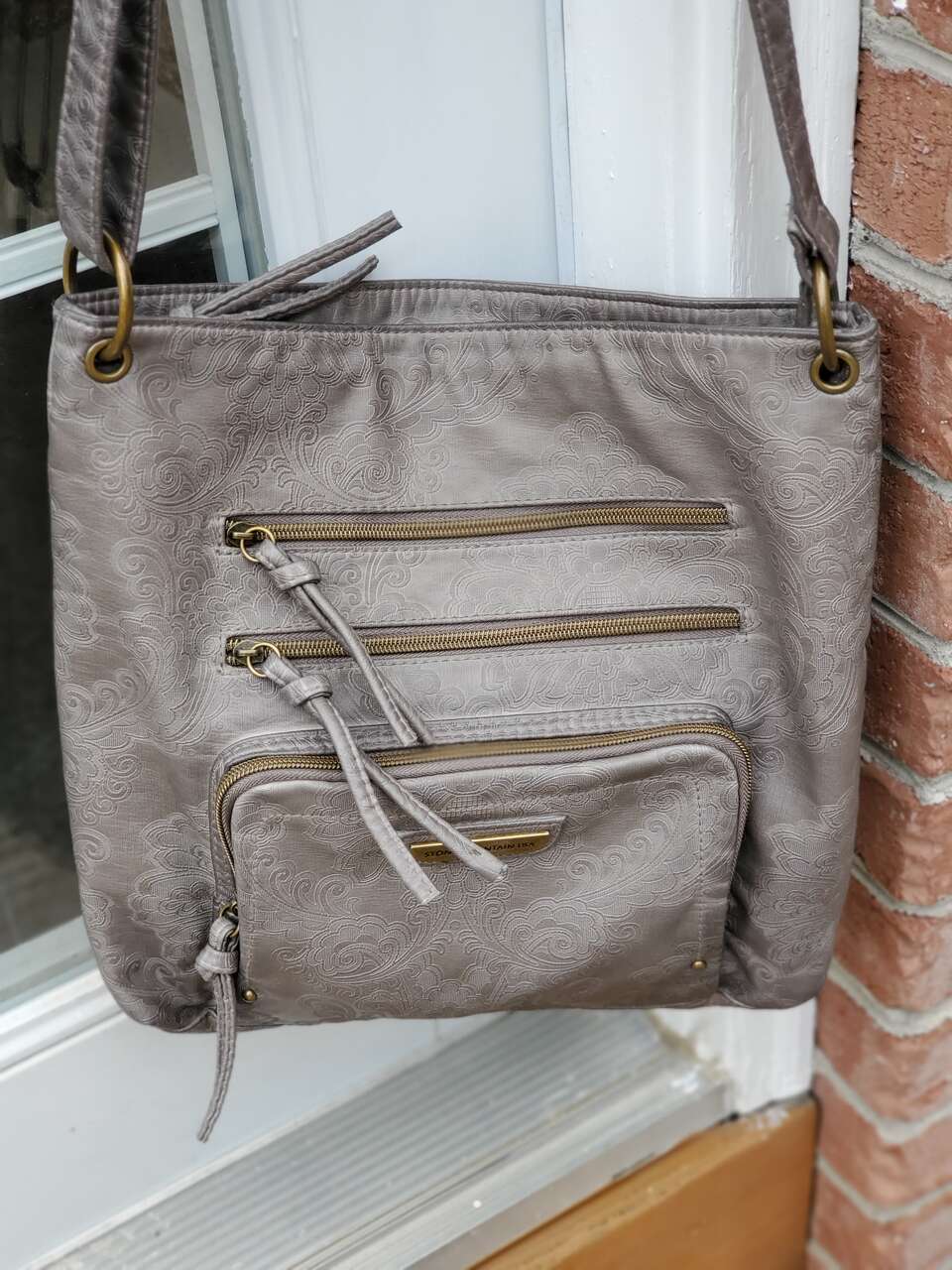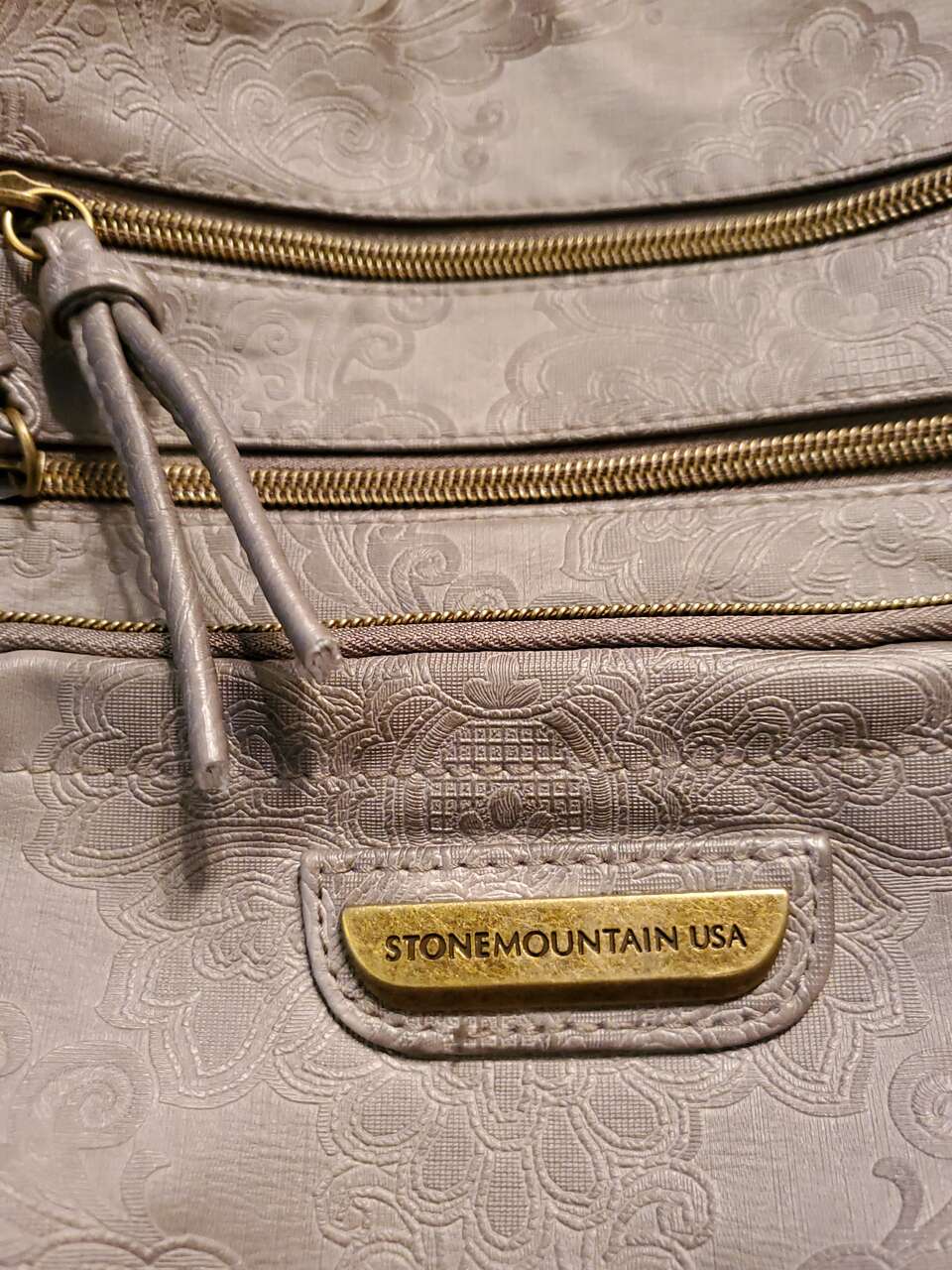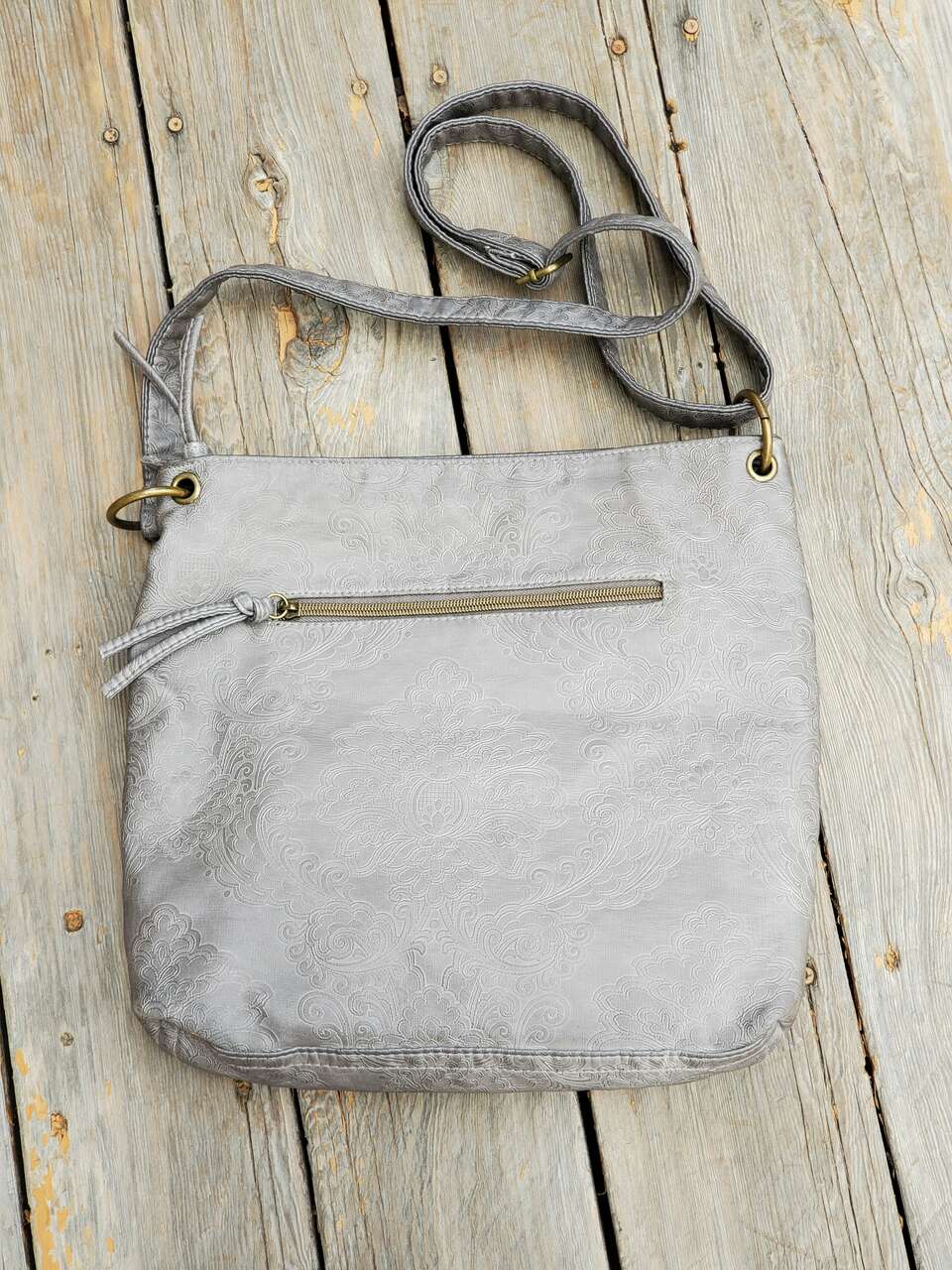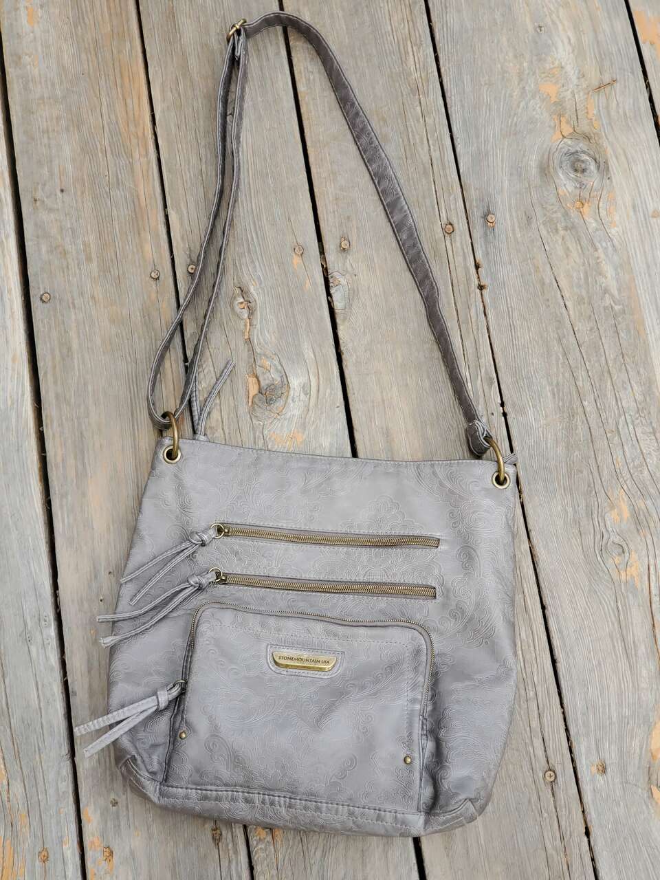 Stone Mountain Grey Super Crossbody Embossed Damask Print Hand Bag Purse Gold-tone Hardware, Top Zipper Closure, Front and Back Zip Pockets, Interior Pockets, Interior Lining. 13" - 26" Adjustable Strap. Dimensions: 13"H X 13" W X 3" D. Cash Only, No Codes.