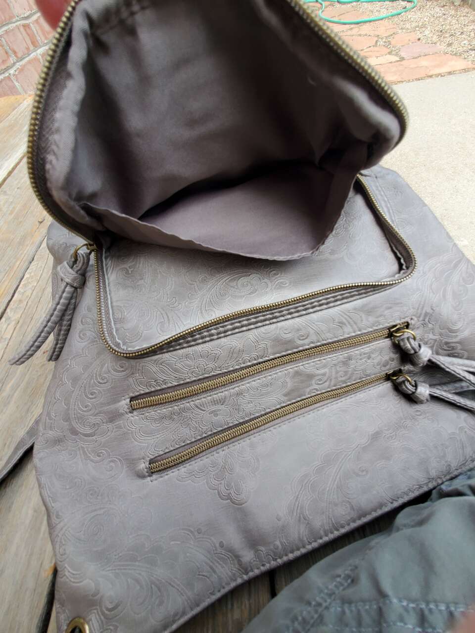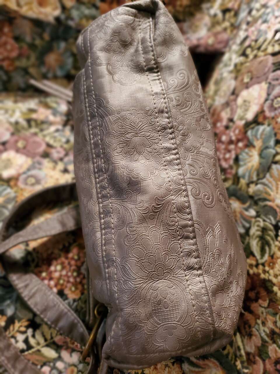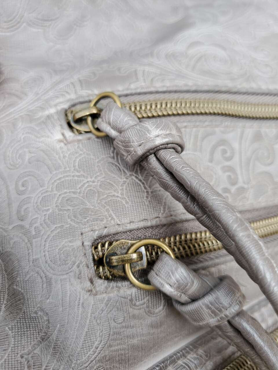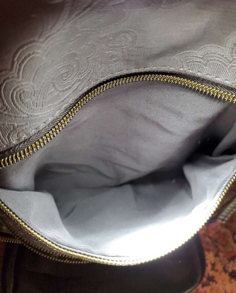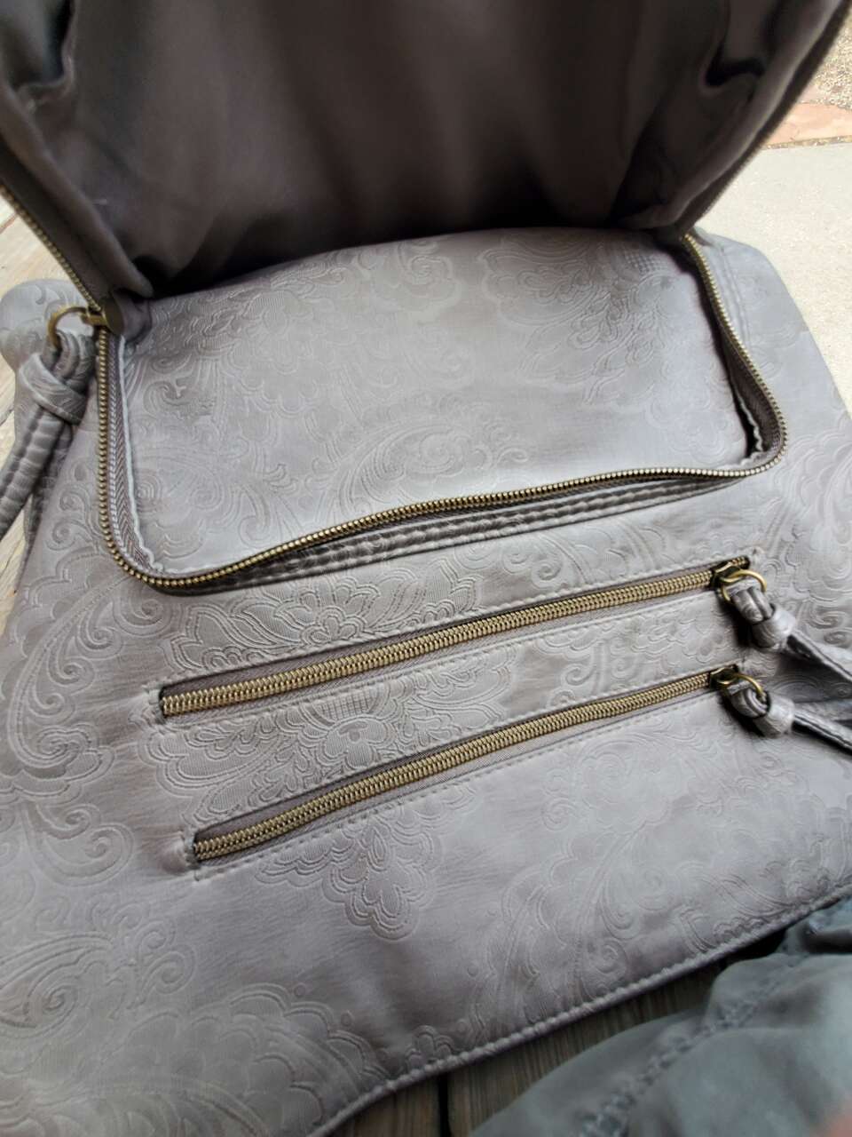 Stone Mountain Grey Super Crossbody Embossed Damask Print Hand Bag Purse Gold-tone Hardware, Top Zipper Closure, Front and Back Zip Pockets, Interior Pockets, Interior Lining. 13" - 26" Adjustable Strap. Dimensions: 13"H X 13" W X 3" D. Cash Only, No Codes.