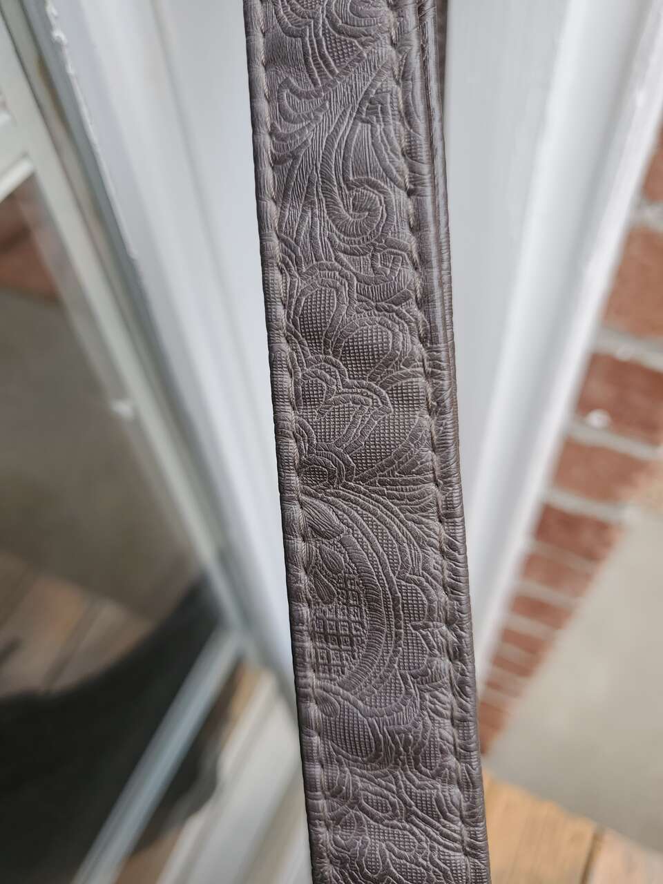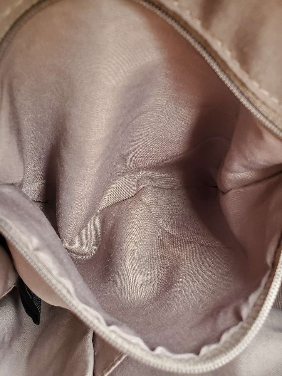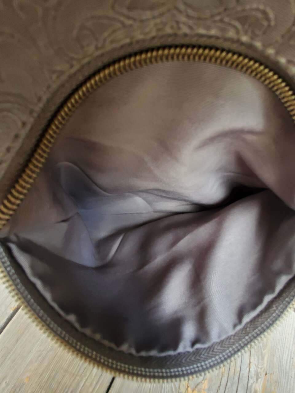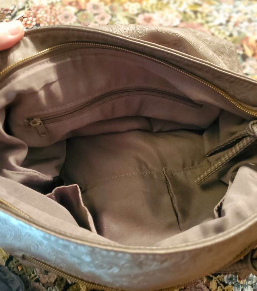 Stone Mountain Grey Super Crossbody Embossed Damask Print Hand Bag Purse Gold-tone Hardware, Top Zipper Closure, Front and Back Zip Pockets, Interior Pockets, Interior Lining. 13" - 26" Adjustable Strap. Dimensions: 13"H X 13" W X 3" D. Cash Only, No Codes.