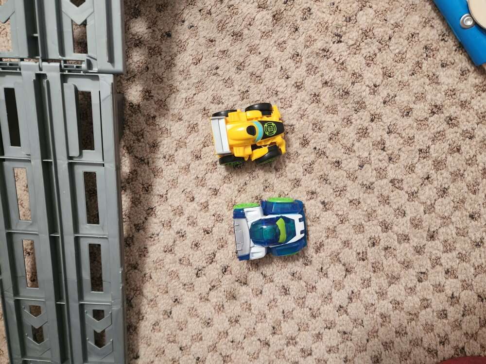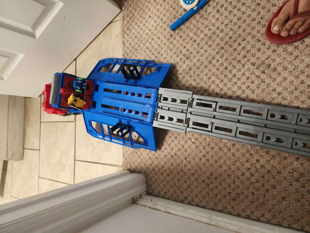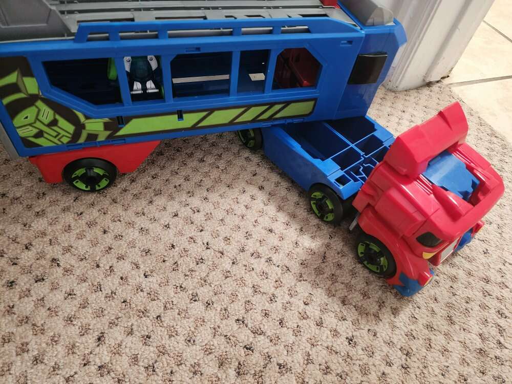 Tranforming race cars and optimus prime with trailer. Asking 25.00 obo