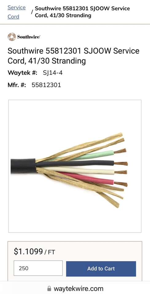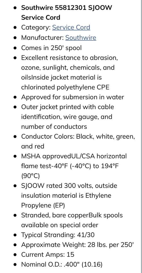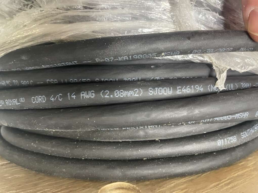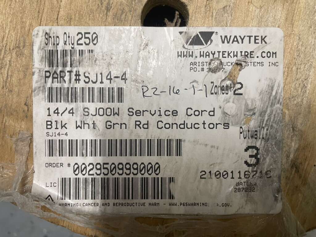 Description- 250’ Spool of 14/4 SJOOW water resistant service cord with black white, green and red conductors. See photos for more product information and specifications.