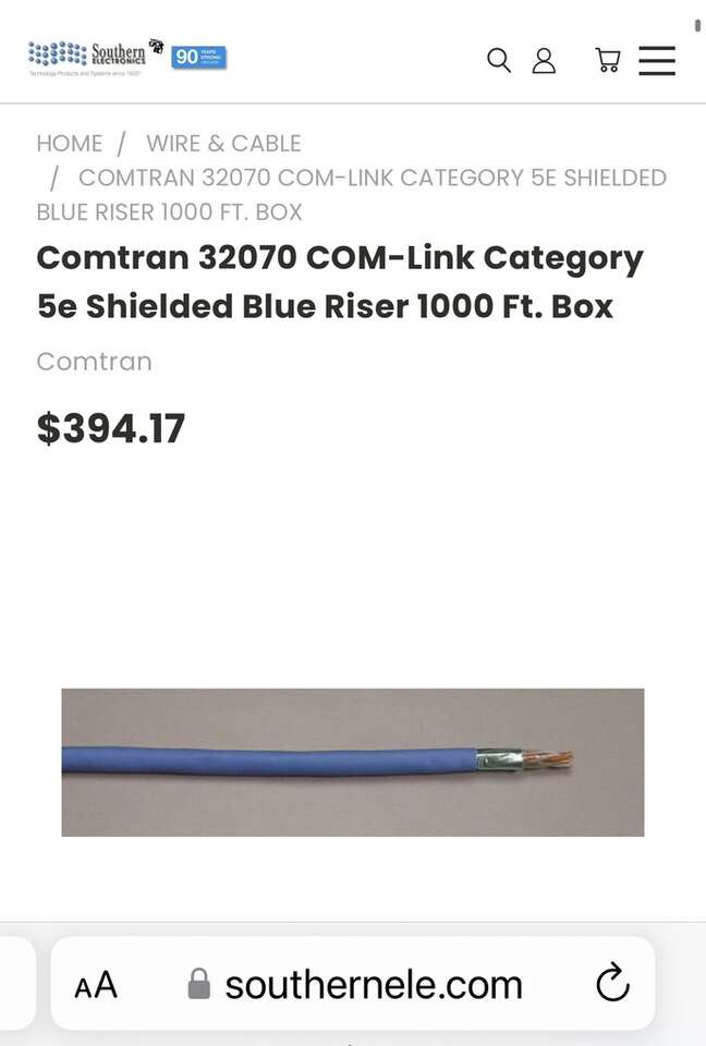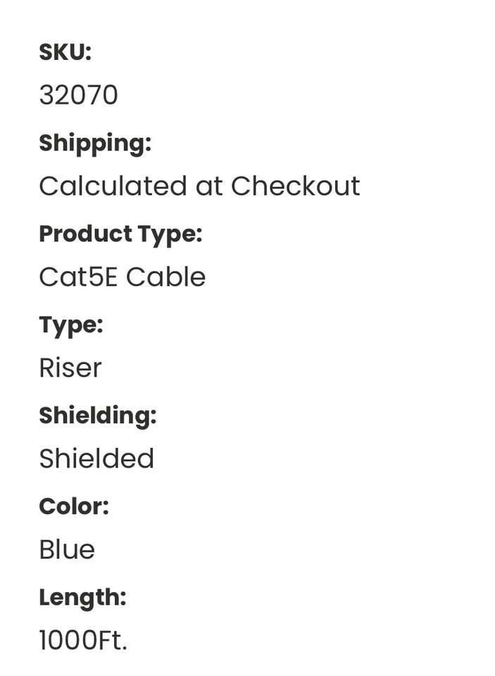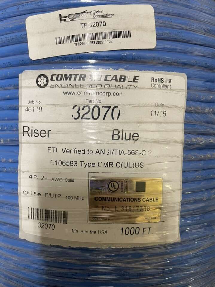 Description- 1000’ Spool of COM-LINK Category 5e shielded blue riser. See photos for more product information and specifications.