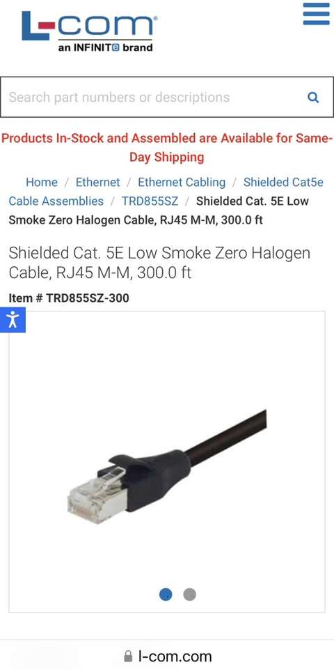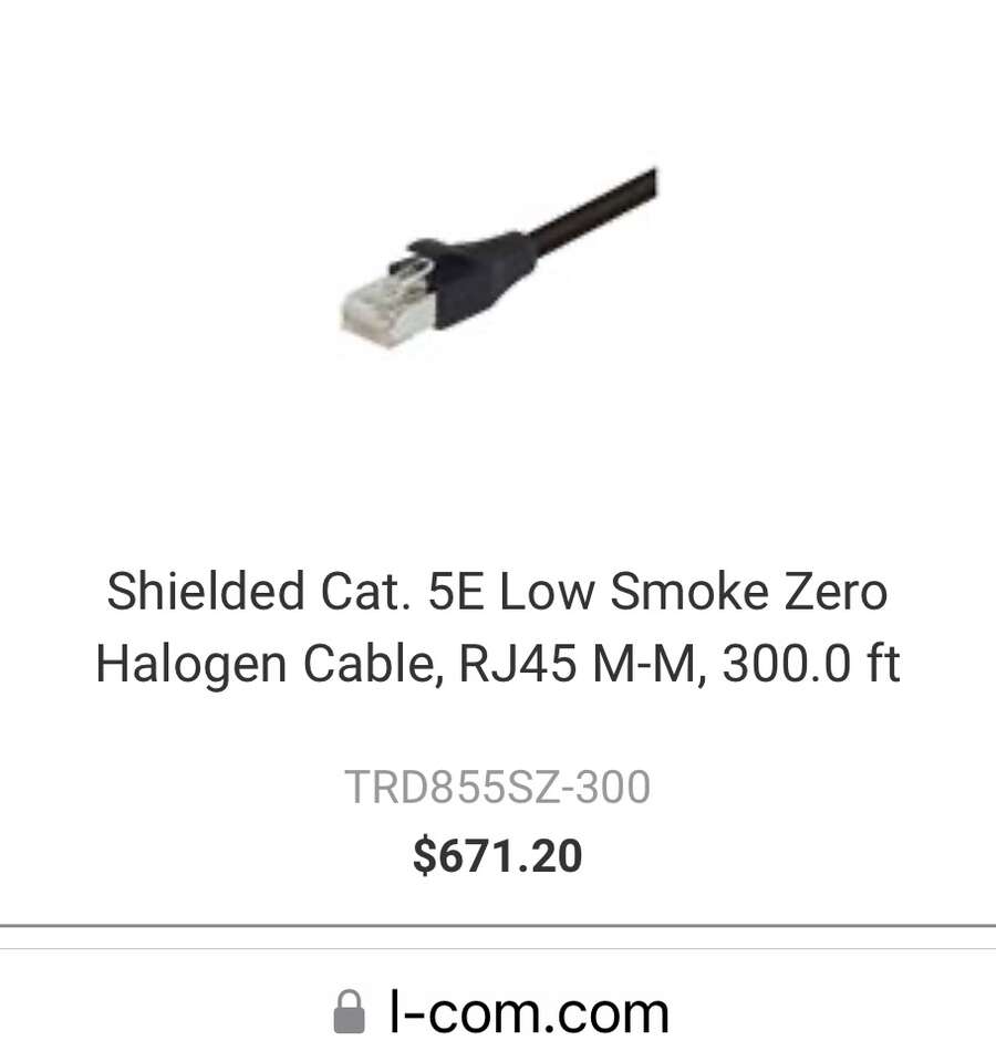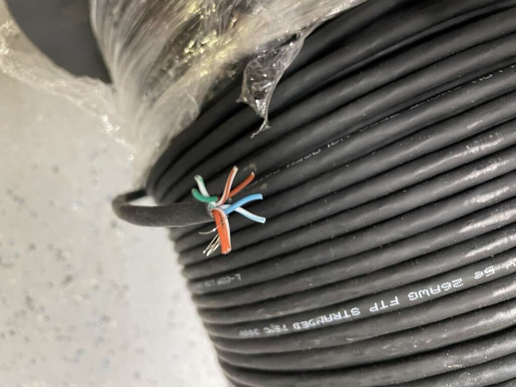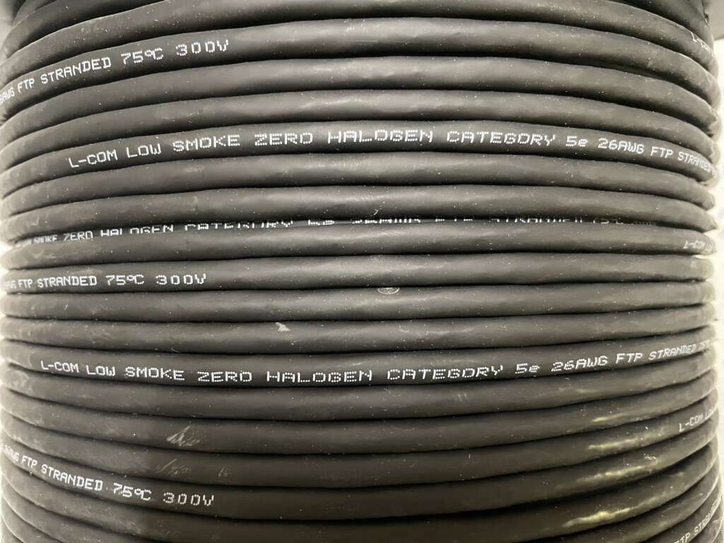 Description- Approximately 300’ spool (Spool, not marked with length. Some of the wire on the outer layer has slight shipping damage. I estimate that there is 300+ feet of perfect usable wire. I am happy to unspool it with you at time of purchase to verify length and adjust price accordingly if length is different) L-Com, Low Smoke, Zero Halogen, Shielded, Category 5e, 26 AWG, 4-Pair, FTP, Stranded, 300 V. See photos for more product information and specifications.