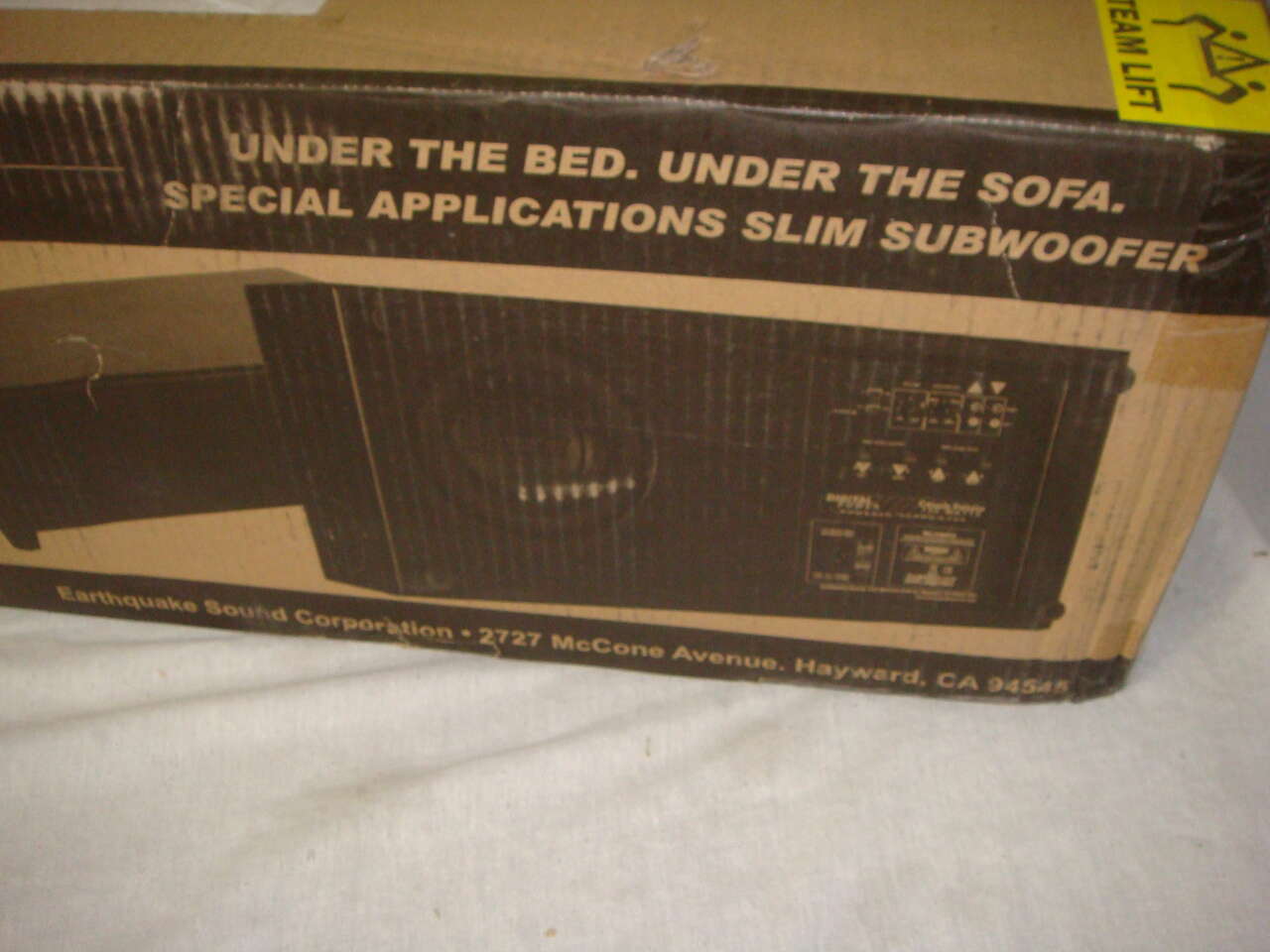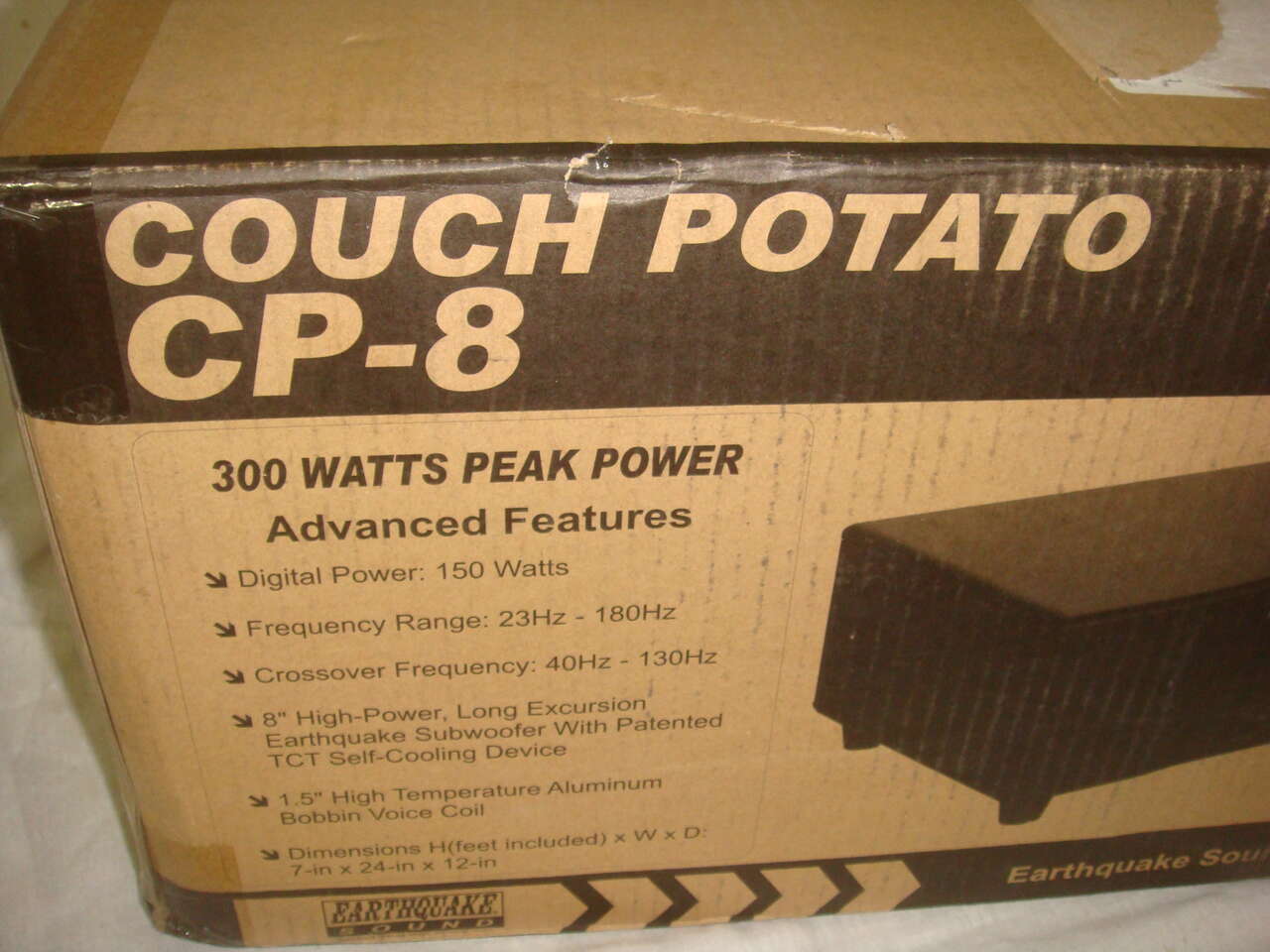 BRAND NEW EARTHQUAKE SOUND CP-8 COUCH POTATO SLIM 300W POWERED 8" DOWN FIRING SUBWOOFER. This was only opened for the photos. The original box was slightly distressed, but the contents and packaging are otherwise in new, perfect condition and works perfectly.