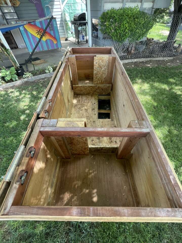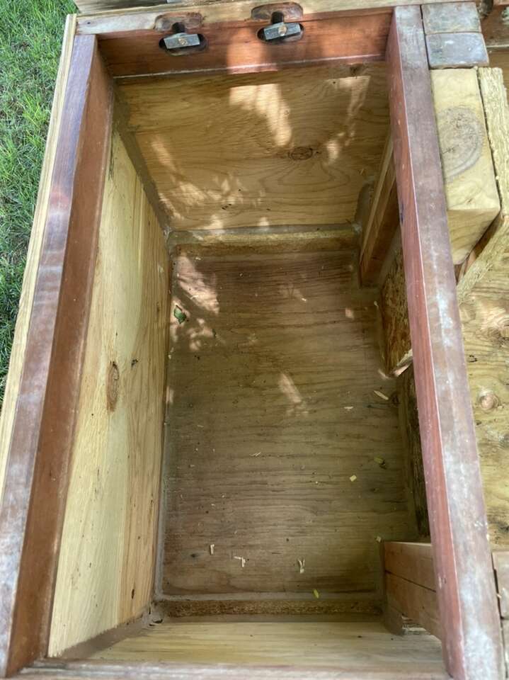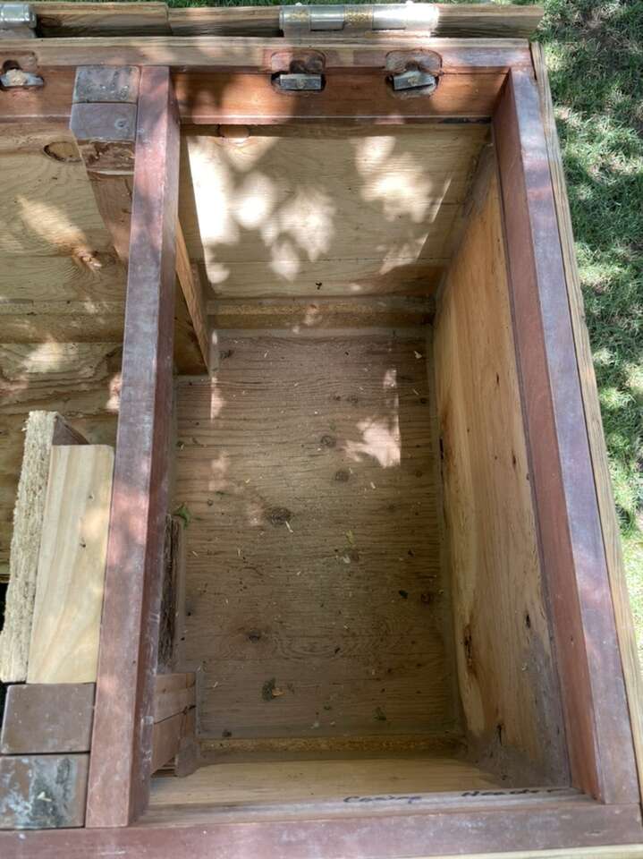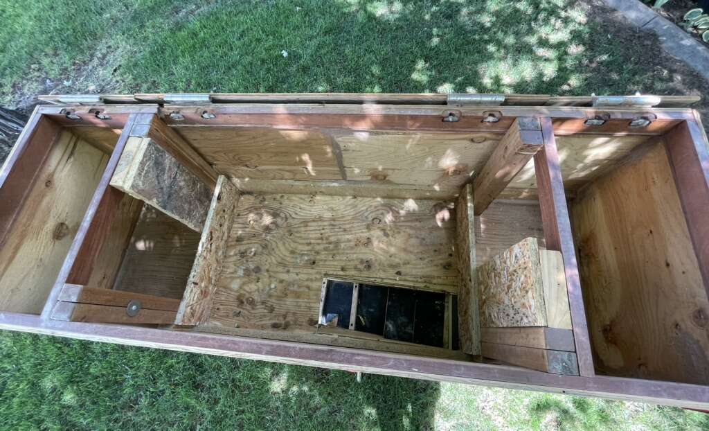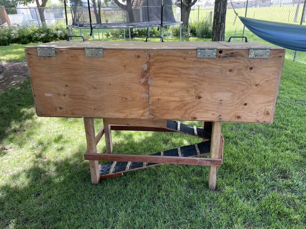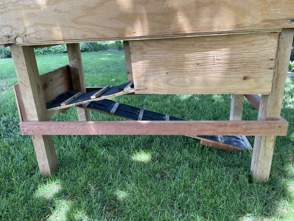 We’ve used this for a few sets of chicks and it’s worked great. There are two nesting boxes where mama hen would keep her babies. We’d put food and water in containers in the middle and have small ramps for the chicks to walk down from the nesting box (see last photo). Once they got a little bigger, we’d open the main ramp area so they could go down the long ramp. We put a small fence around the bottom since we didn’t want them to free range (we have too many hawks). We were able to use this as a temporary coop while they grew.
