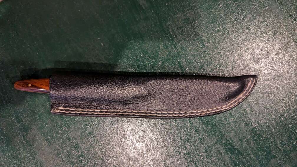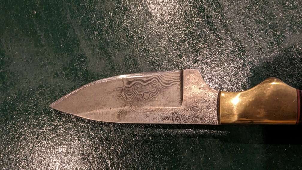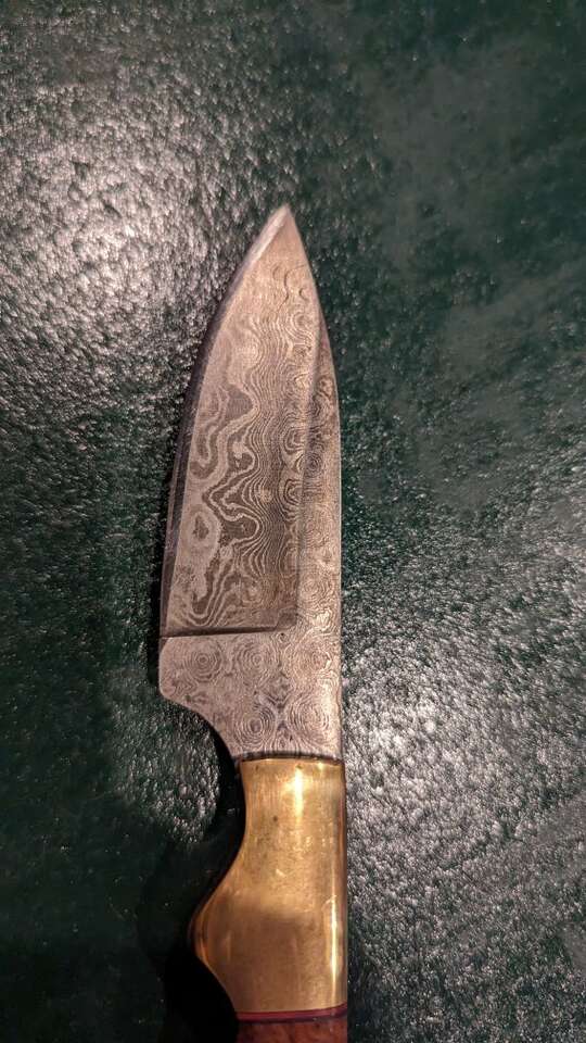 Super nice and unique Damascus knife. Used a bit but only to cut steak. Full length is 8 1/2". Handle is 5". Blade length is 3 1/2". Full tang. Spine thickness is 3/16". $50 firm