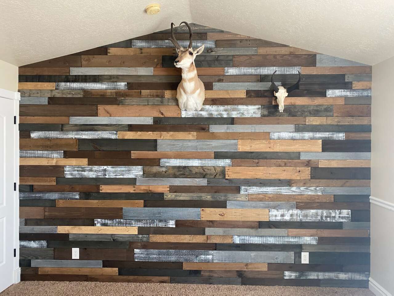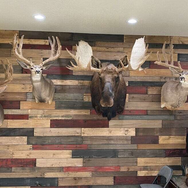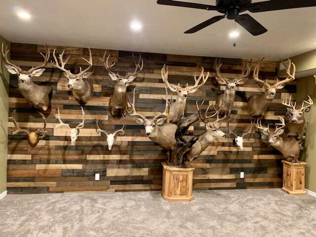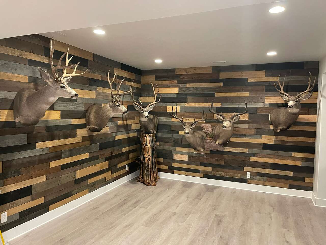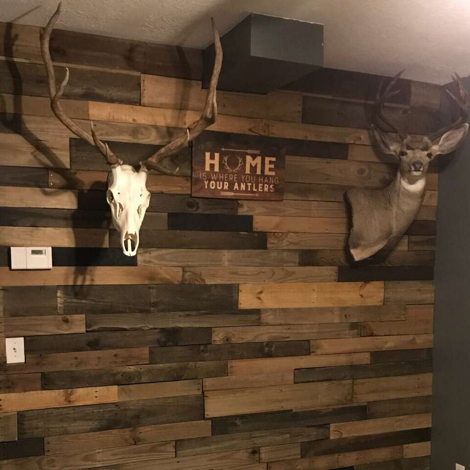 Reclaimed pallet walls are popular for all of your trophy mounts. Our natural colors perfectly compliment the natural tones in the animals hide. Do something you've always wanted to do...Deck out your trophy room with reclaimed pallet wood. The hardest choice is whether to do one pallet wall or the entire room. We have 15 colors to choose from in 2 sizes. Visit our showroom in Taylorsville or online at www.slcpalletwalls.com. We sell the wood for $3/sqft or we can install it for $9sqft which covers everything.