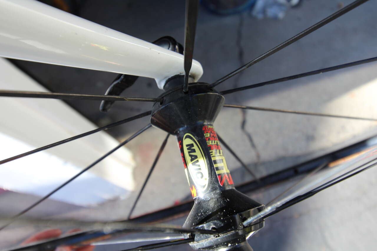 The wheels are Mavic Ksyrium Elites--with Tannus run-flat / tubeless tires. (Impossible to get a flat with these tires... so you can ride without extra tubes, without C02 cartridges, without tools, etc.) These are easy to replace if you prefer a typical tube / tire set up.