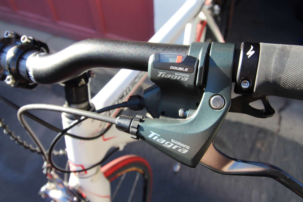 This one was purpose built last year with a new Shimano Tiagra 10 speed flat bar / hybrid groupset with Ultegra brake calipers and crankset. The cassette and chain were installed new last year with the Tiagra group as well as all of the cables and housings, handlebar, stem and ergonomic grips.
