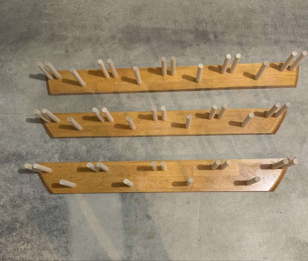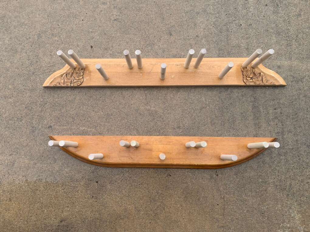Ski racks hand made from repurposed hardwood and new wooden dowels. Makes for an easy and secure storage option for any type of skis. Add to a garage, mud room, gear room, basement or shop. Each rack also includes pegs for hanging poles.