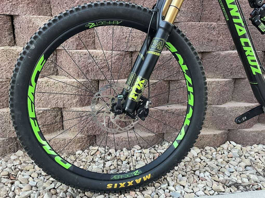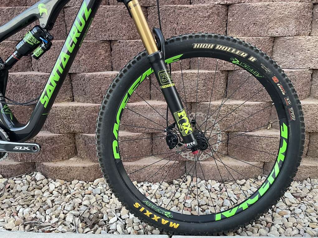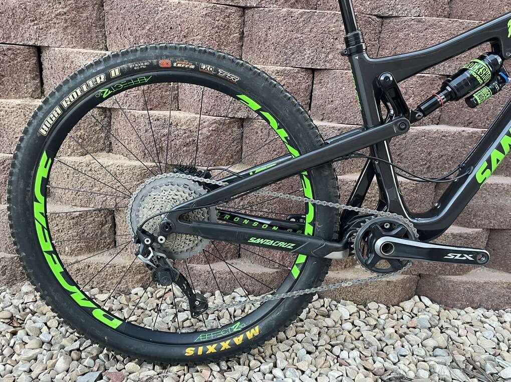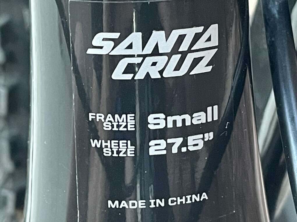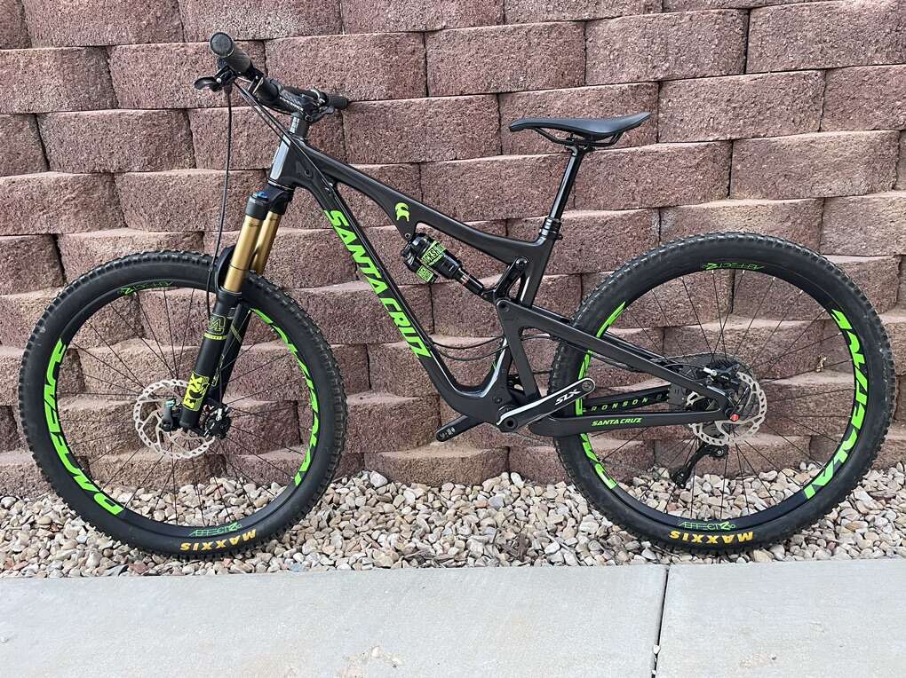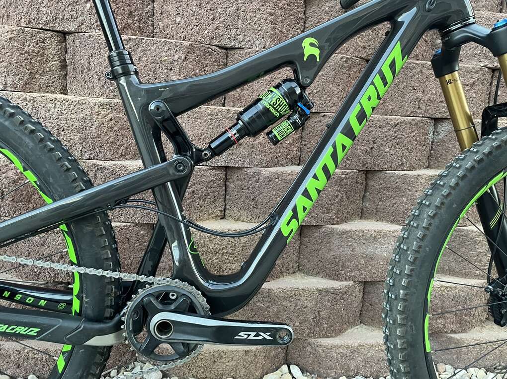 Frame Material: CC carbon fiber Suspension: VPP Rear Shock: Rock Shox Monarch Plus RC3 Rear Travel: 150mm Fork: Fox 34 Float Factory Front Travel: 150mm Headset: Cane Creek 40 Shifters: Shimano SLX Rear Derailleur: Shimano SLX ISCG Tabs: yes, ISCG 05 Crankset: 32t Shimano SLX Bottom Bracket: included w/ crankset Crank Arm Length: 175mm Cassette: 11 - 46t Shimano XT M8000 Chain: Shimano SLX CN-HG601 11-Speed (New) Brakeset: Shimano SLX Brake Type: hydraulic disc (Shimano Mineral Oil) Rotors: 180 / 180mm Shimano RT66 Handlebar: Race Face Handlebar Width: 800mm Grips: Lizard Skins Moab Lock-on Stem: Race Face Evolve Saddle: Bontrager Verse Elite 145mm Seatpost: Bontrager dropper post 150mm travel Seatpost Diameter: 31.6mm Seat Collar: Santa Cruz Dropper Remote: Crank Brothers Highline Wheelset: Race Face Aeffect R30 27.5in Hubs: Race Face Front Axle: 15 x 110mm Boost Rear Axle: 12 x 148mm Boost Tires: [front & rear] Maxxis High Roller II EXO TR 3C Maxx Terra Tire Size: [front] 27.5 x 2.4in [rear] 27.5 x 2.3in Pedals: not included Extras: custom decals Claimed Weight: 30lbs Recommended Use: all-mountain, trail, enduro