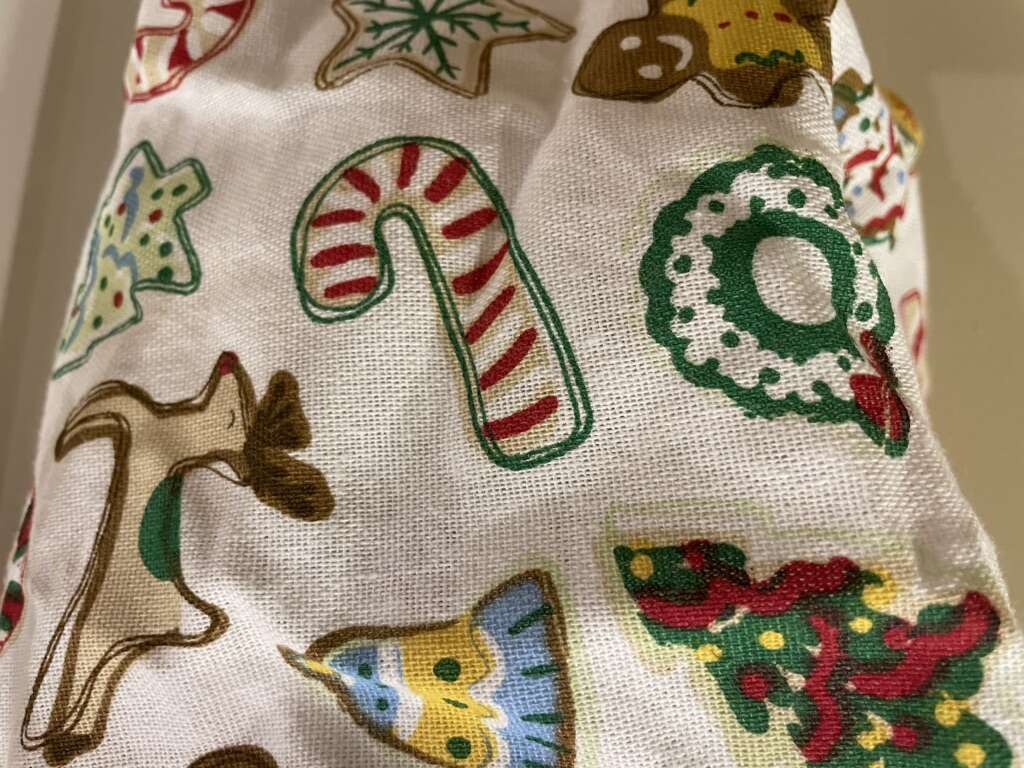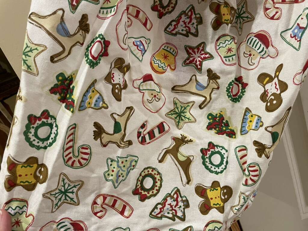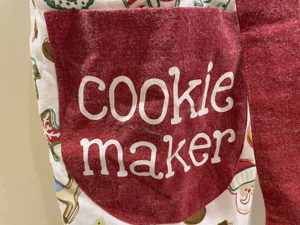 I have a cute new apron covered with Christmas cookies. It has a big red pocket on the left side that says Cookie maker. It has a big red tie at the waist. It is a waist or half apron so it doesn’t cover the top of you. I’m just 5’3” but it goes to the top of my knees. See my other ads for jewelry, artwork, home decor and more.