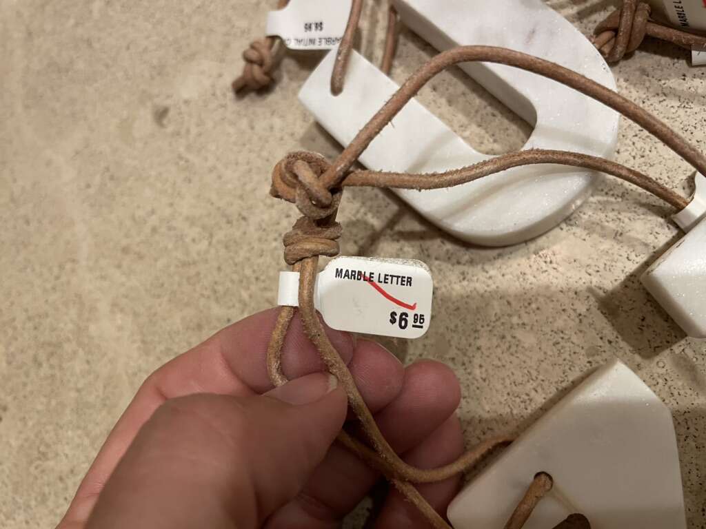 I gave some beautiful new thick white marble letter ornaments. They have some really light tan veining in the marble. They have thin leather straps to hang them with. They are just over 2 1/2 inches tall (without the hangers) and are 3/8 inches thick. I have the letters X, V (2 of them), I (6 of them), Q (6 of them), U (7 of them), Z (3 of them) and Y (5 of them). The price tags show they were $6.95 each. I’m asking $1. See my other ads for jewelry, artwork, home decor and more.