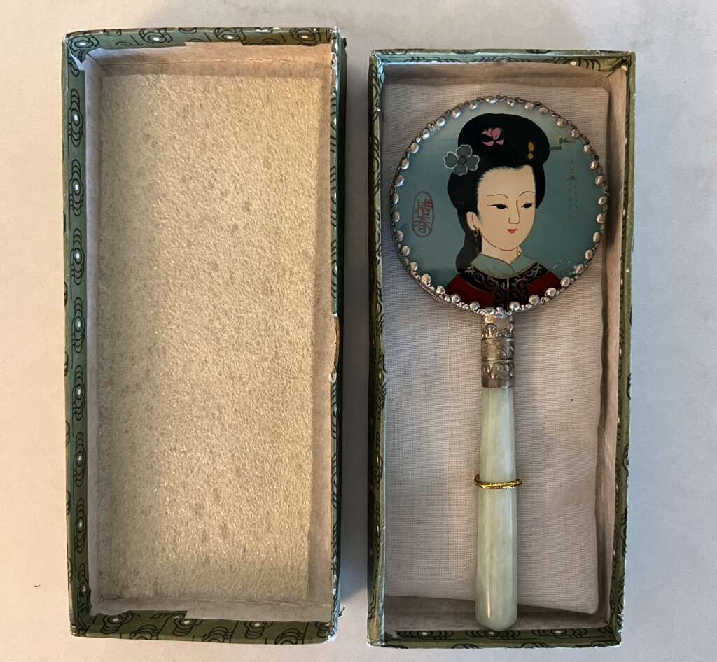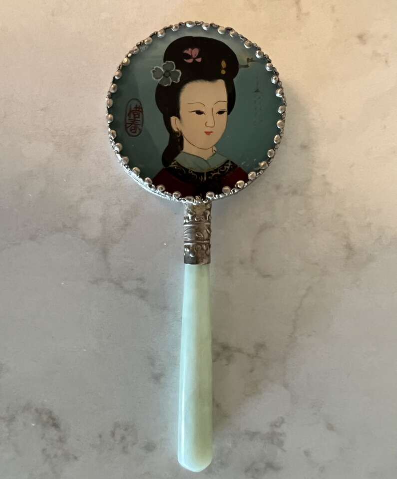 • Beautiful hand-held mirror, expertly crafted & painted, new-in-box, $7