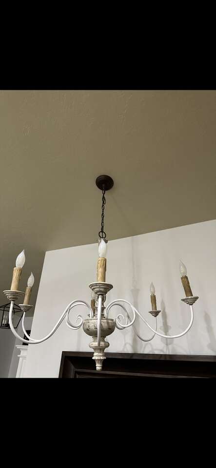 6 Light Wood & Metal Chandelier 46” X 36” please text 801-644-3368 very nice! No codes