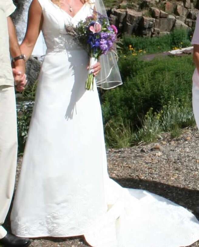 Simple, satin and lined beautiful wedding with detailed stitching and sequence around rib cage and train. This fits 115 pounds, 5 ‘4”, 34 B - professionally preserved in wedding box. Was $1000 new