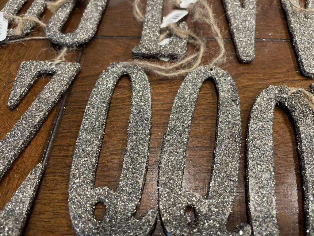 I have 23 new silver glitter letter ornaments on thin rope hanging loops. The letters are about 4 inches tall. I have 1 O, 1 C, 3 Rs, 1 K, 2 Ds, 3 Us, 1 L, 3 Vs, 1 I, 2 Zs, 3 Qs, 3 Ys. The price tags show they were $2.50 each. I’m asking just $1 each or take all of them for $15. See my other ads for jewelry, artwork, home decor and more.