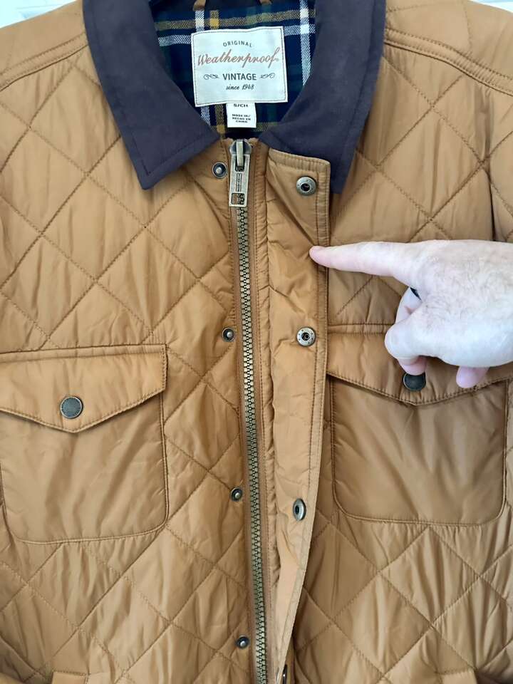 Men’s size small. Like new condition. Basically new. Carmel brown type color. Plaid liner. Buttons and zips. 2 hand pockets and 2 chest pockets. One inside pocket. Stylish. Warm. Comfortable. $25.