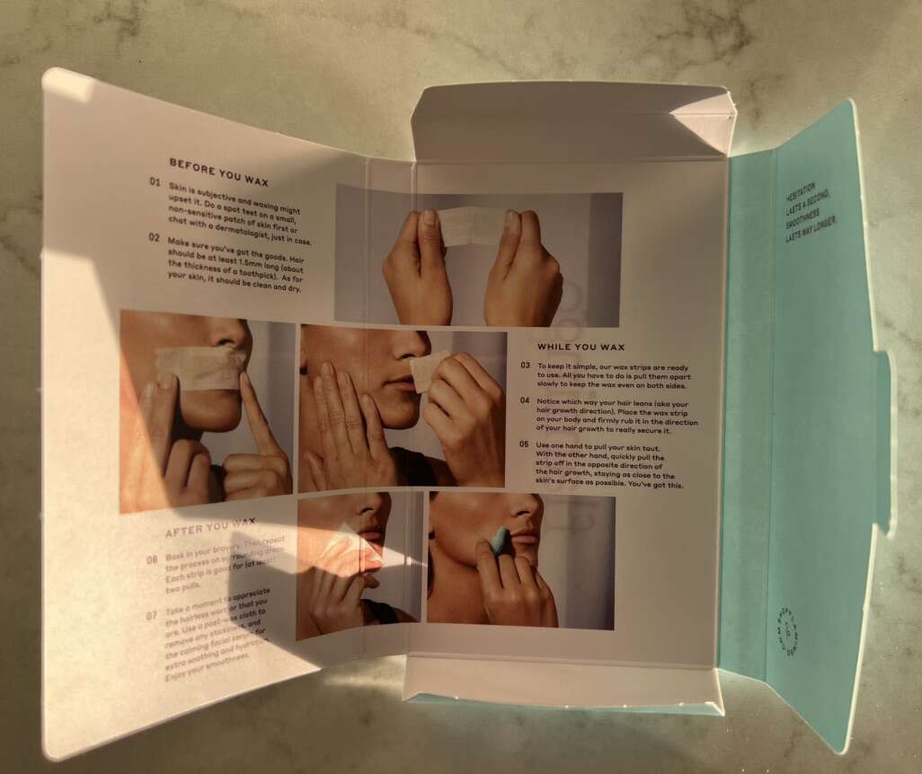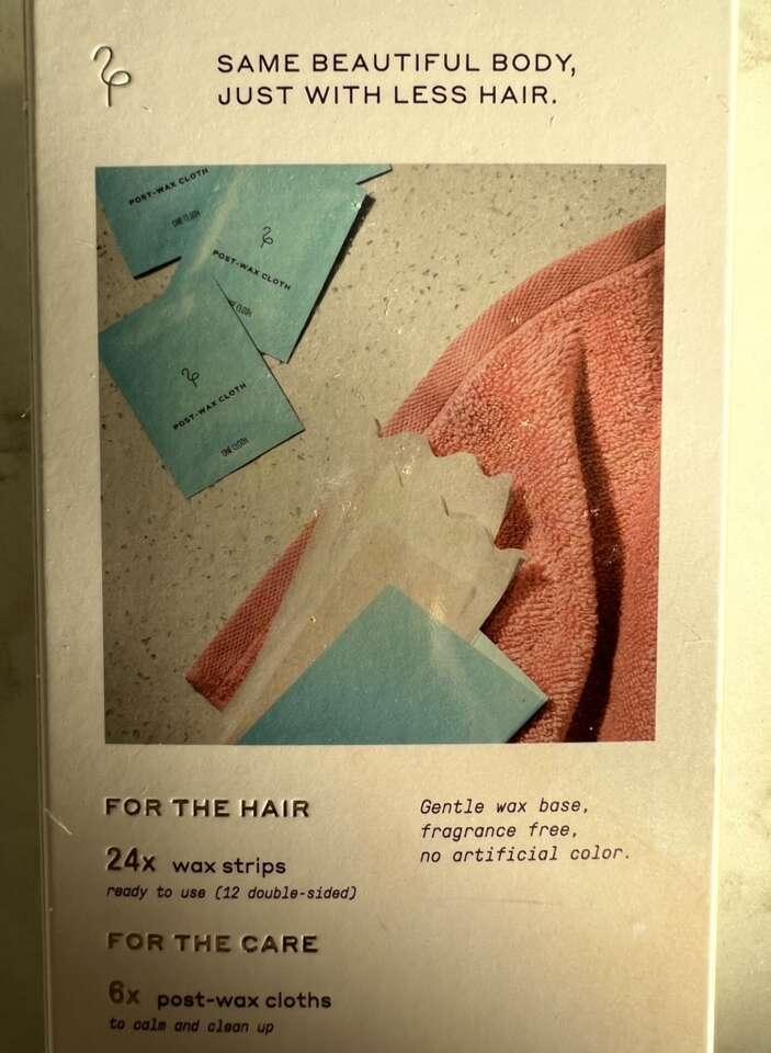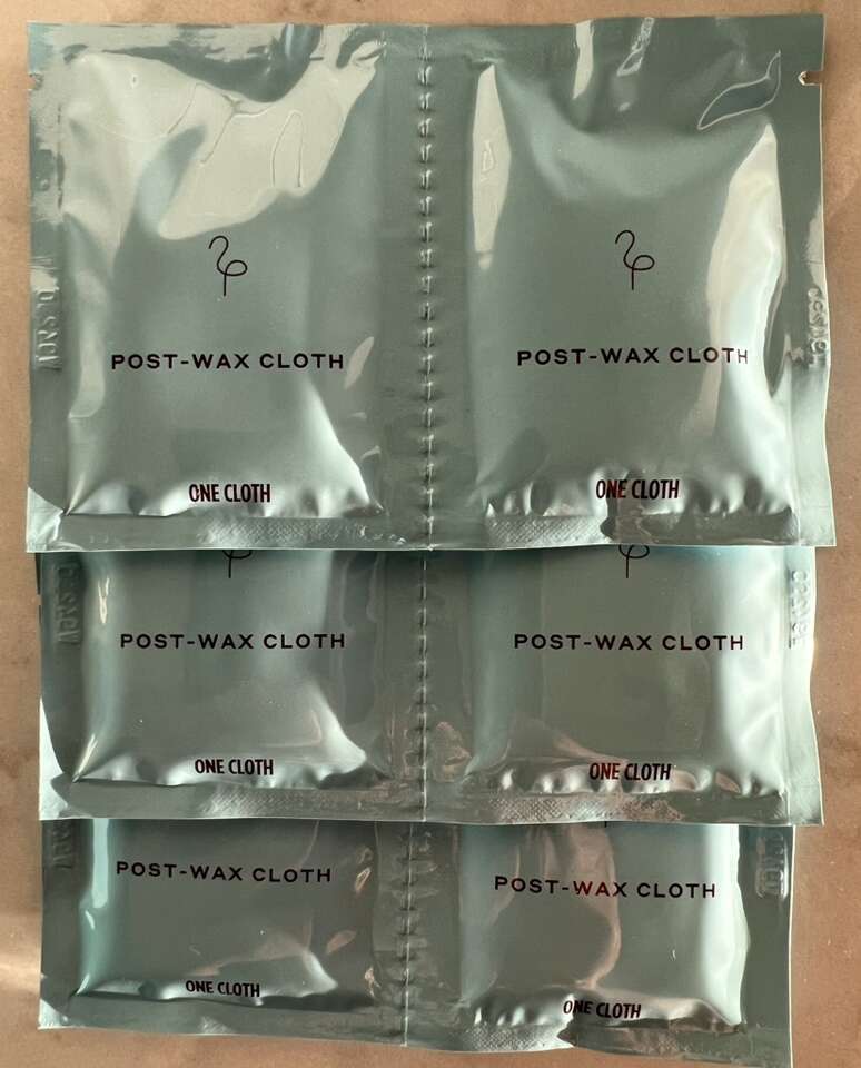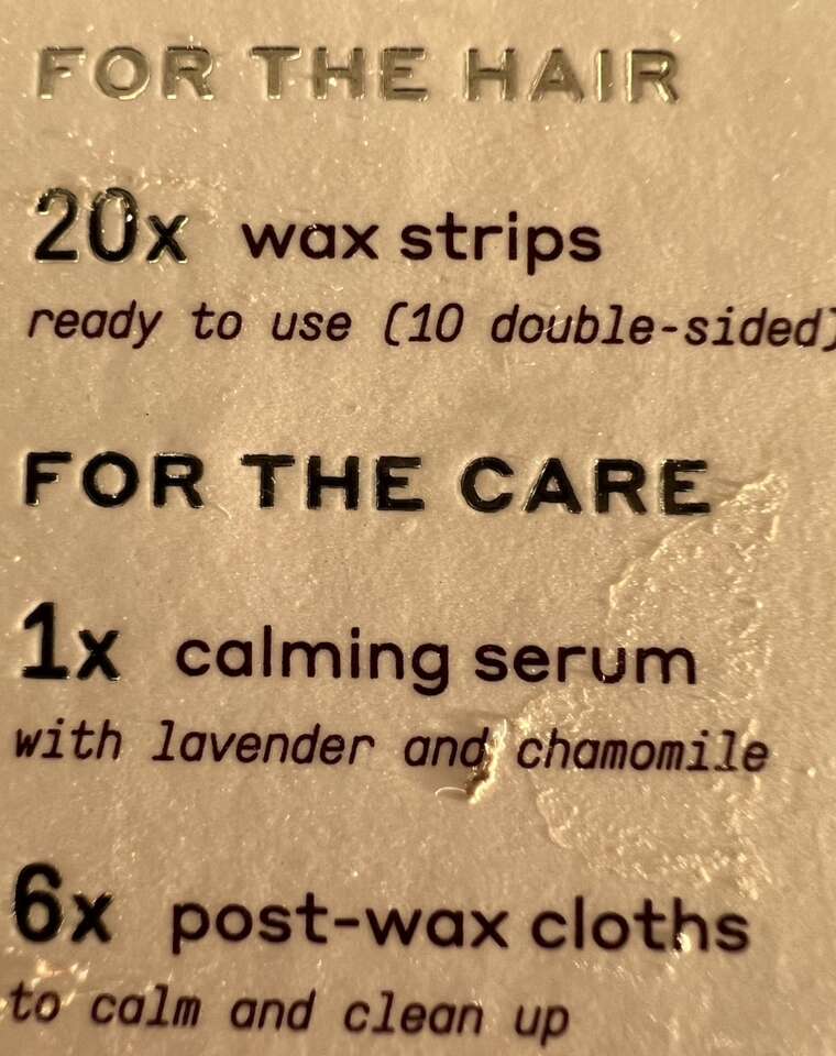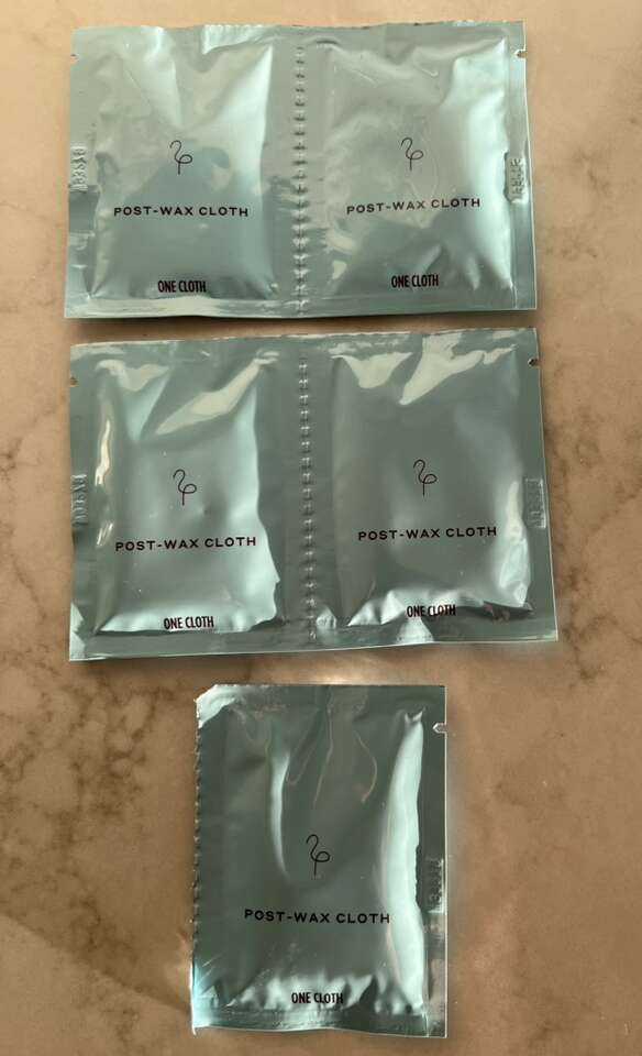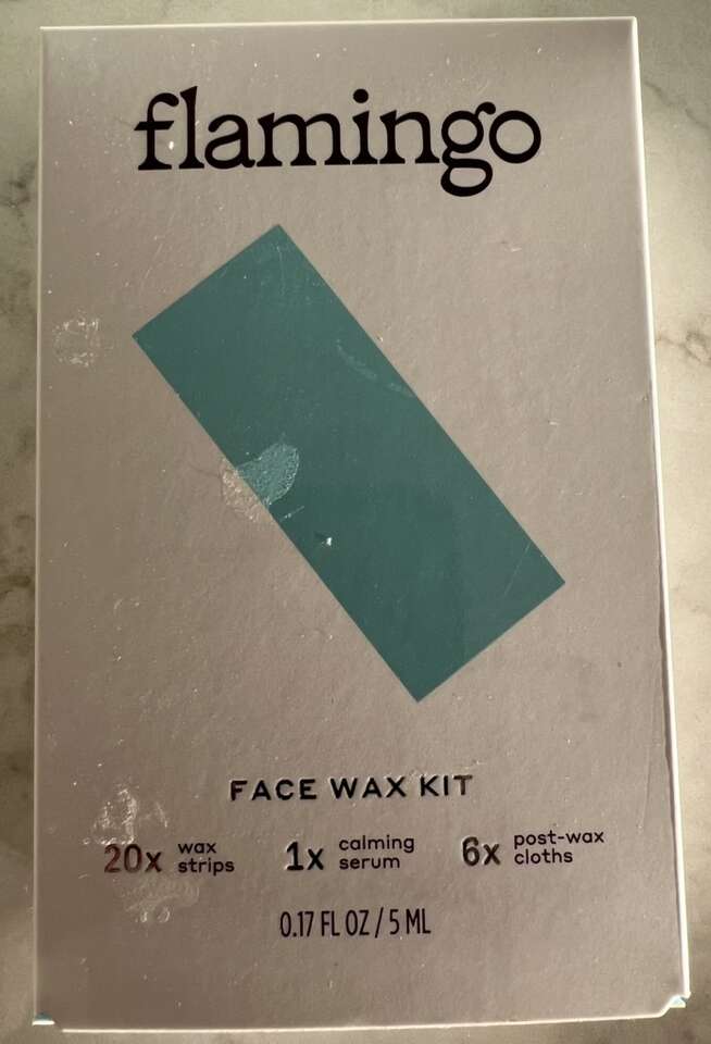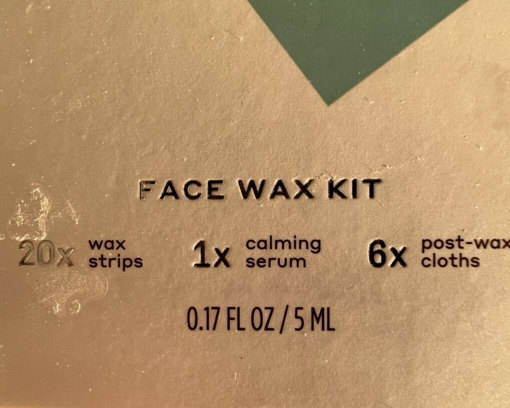 • Face wax kit, with unopened package of wax strips + calming serum + 6 post-wax cloths, $5
