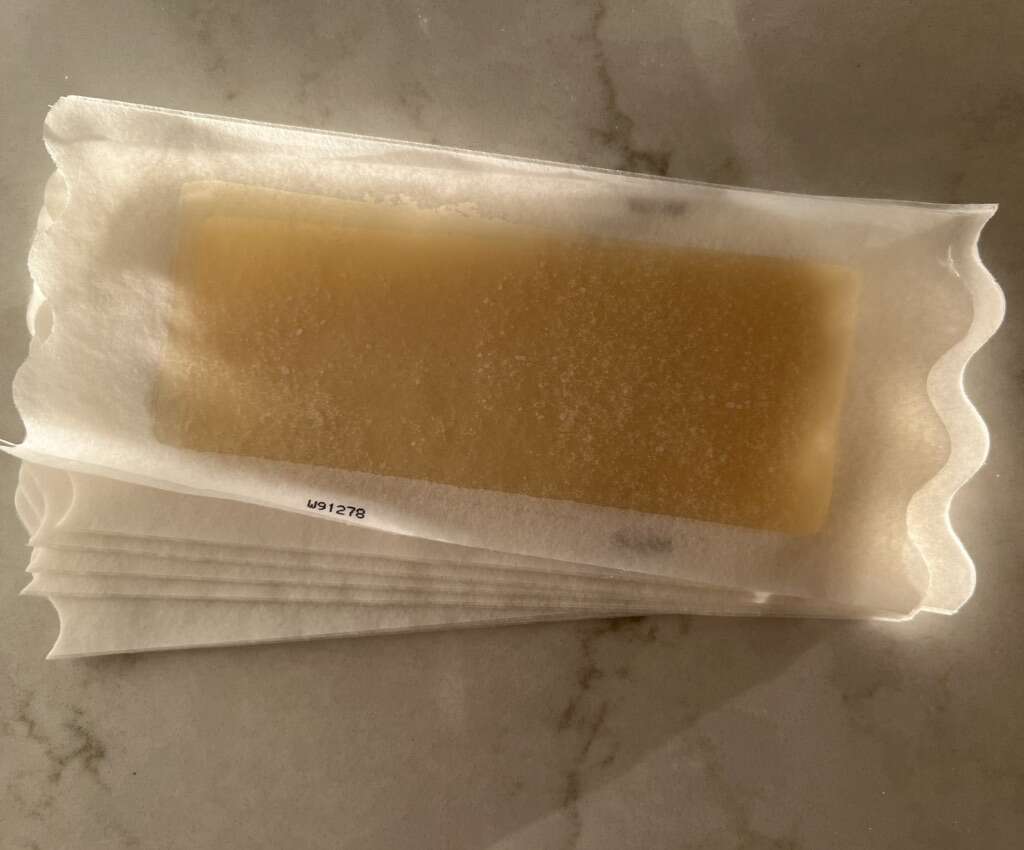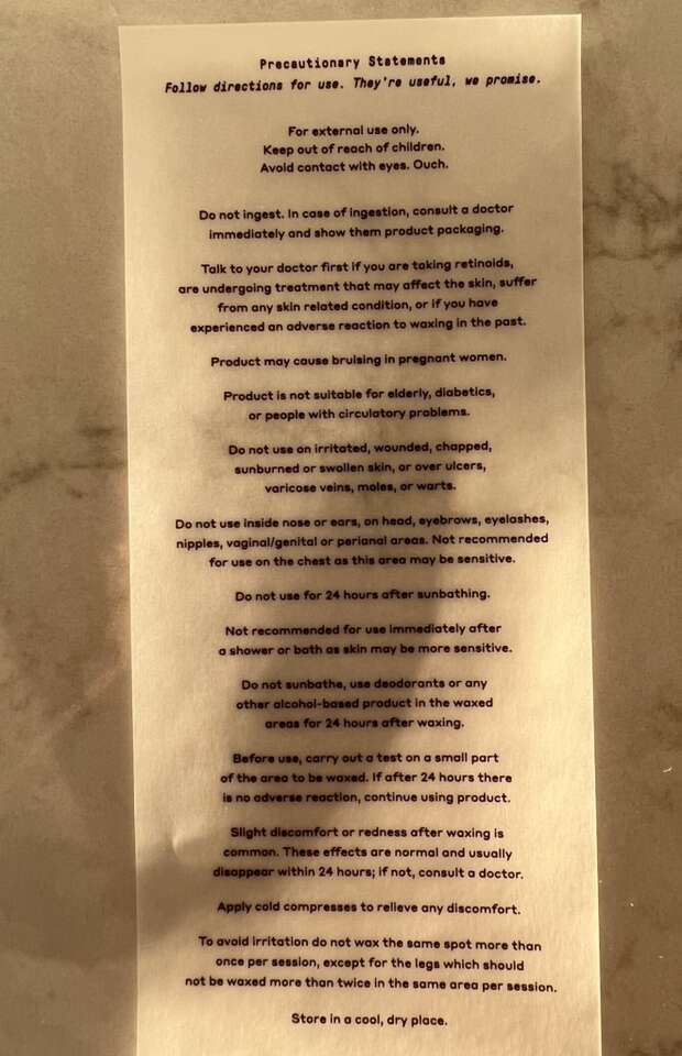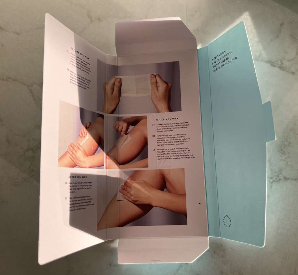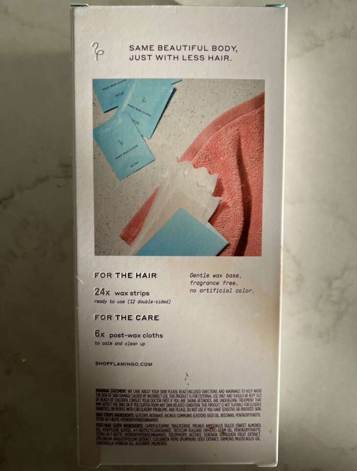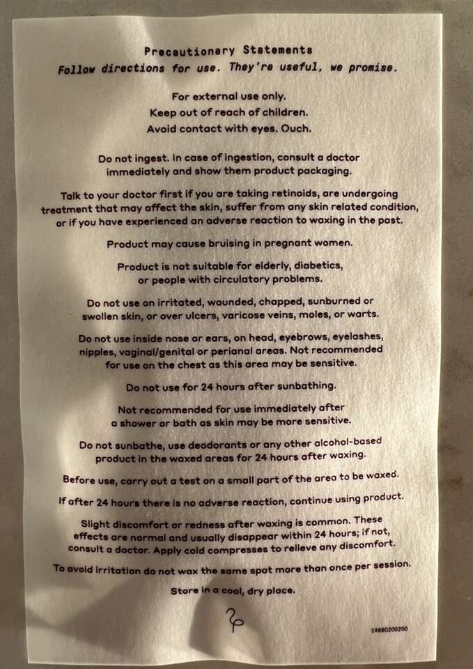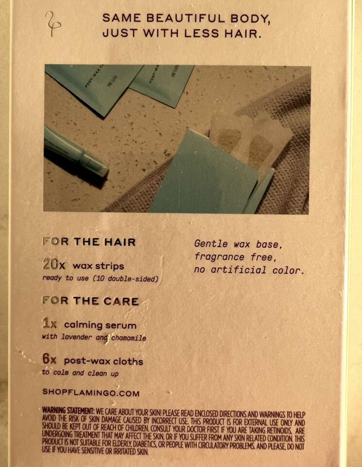 • Face wax kit, with unopened package of wax strips + calming serum + 6 post-wax cloths, $5