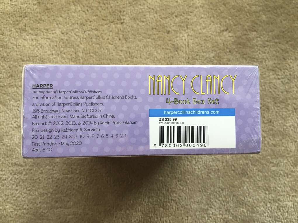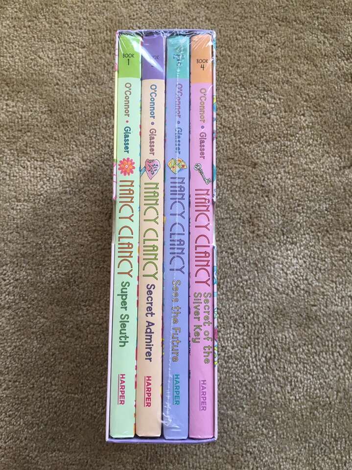 NEW (sealed in plastic) Nancy Clancy 4-Book Box Set, by Jane O’Connor, illustrated by Robin Preiss Glasser (creators of Fancy Nancy). Includes books 1-4 and a bookmark! Nancy Clancy: Super Sleuth, Secret Admirer, Sees the Future, and Secret of the Silver Key. Ages 6-10. Sturdy paperbacks. New, unread condition. Text only. Cash or Venmo.