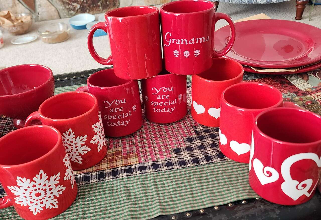 Nine 12 ounce mugs, various designs. $35 for the lot. Also have 'You Are Special' Plates if interested.