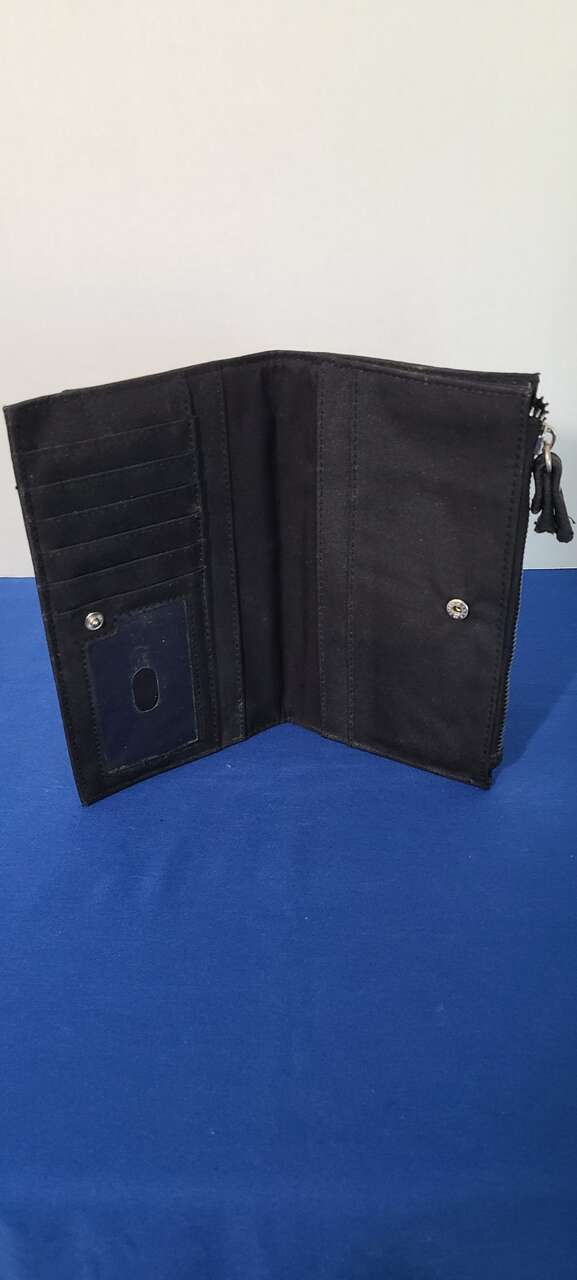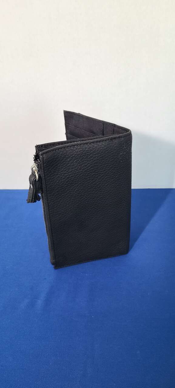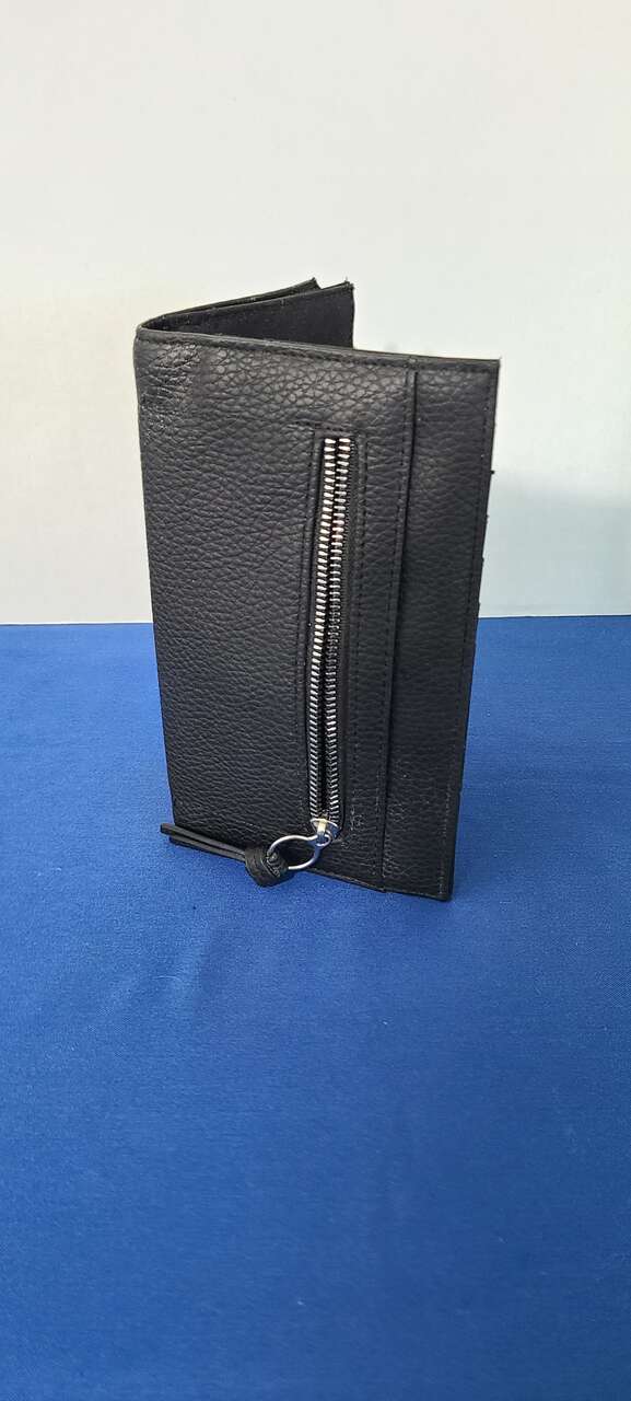 VenmoStylish, 8x5, black leather wallet with 2 large zipper pockets and 6 card pockets.
