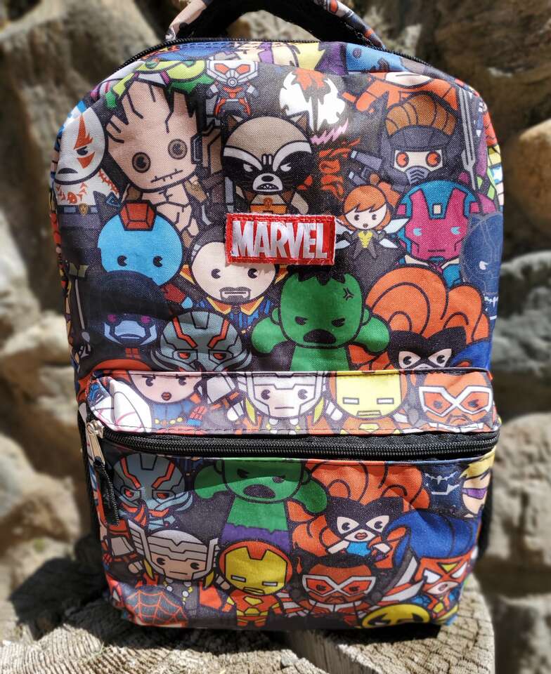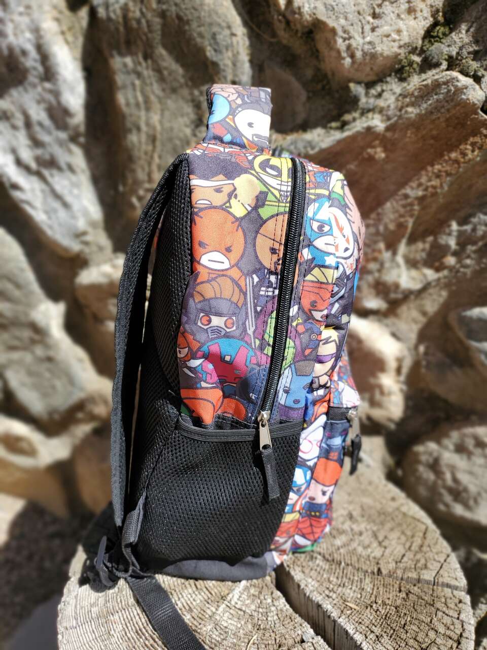 Marvel Kawaii School Backpack . Features 2 Side Mesh Pockets for Water Bottles. Full Length Padded Shoulder Straps and Carry Handle. Zippered Pouch and Large Zippered Secton. 20" X 11" X 5". Cash Only, No Codes.