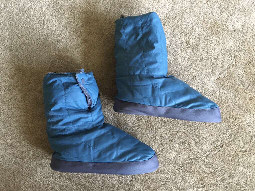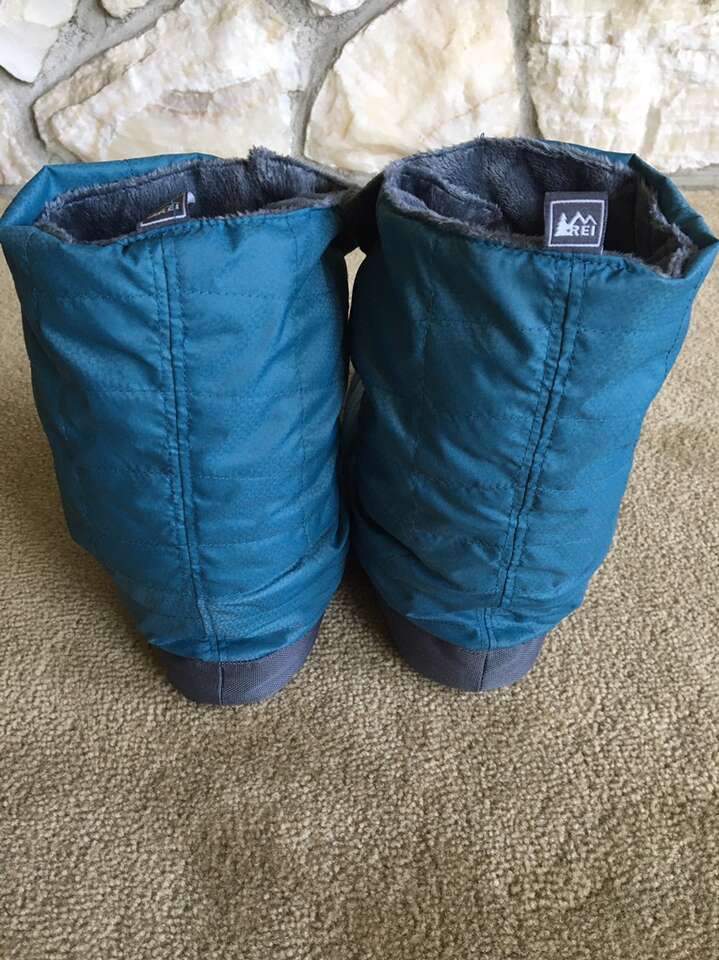 Blue REI Down Booties, Women’s 7-8. Quilted polyester shell, soft fleece lining, duck down filler. Snap closure, polyester soles with grippy beads. Excellent condition. Text only. Cash or Venmo.