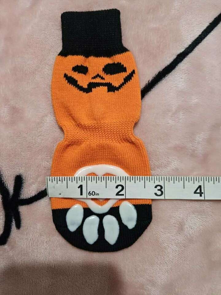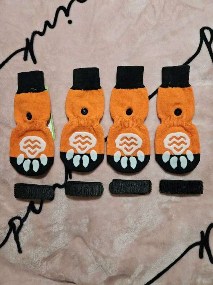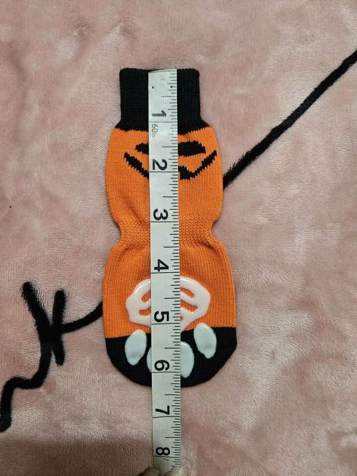 This size medium dog socks glow in the dark. They are 75% cotton 25% polyester. These are new with tags. All my items come from a smoke free home. Any questions please feel free to contact me.