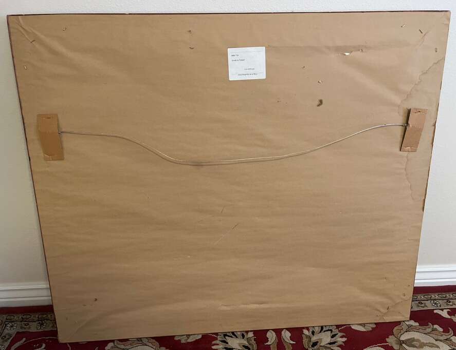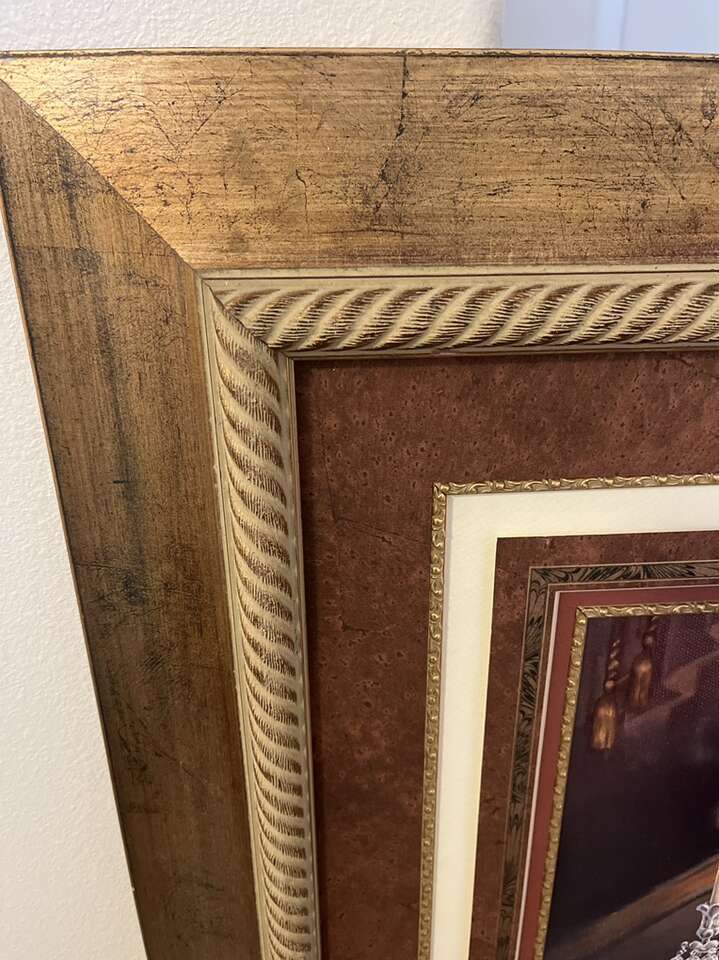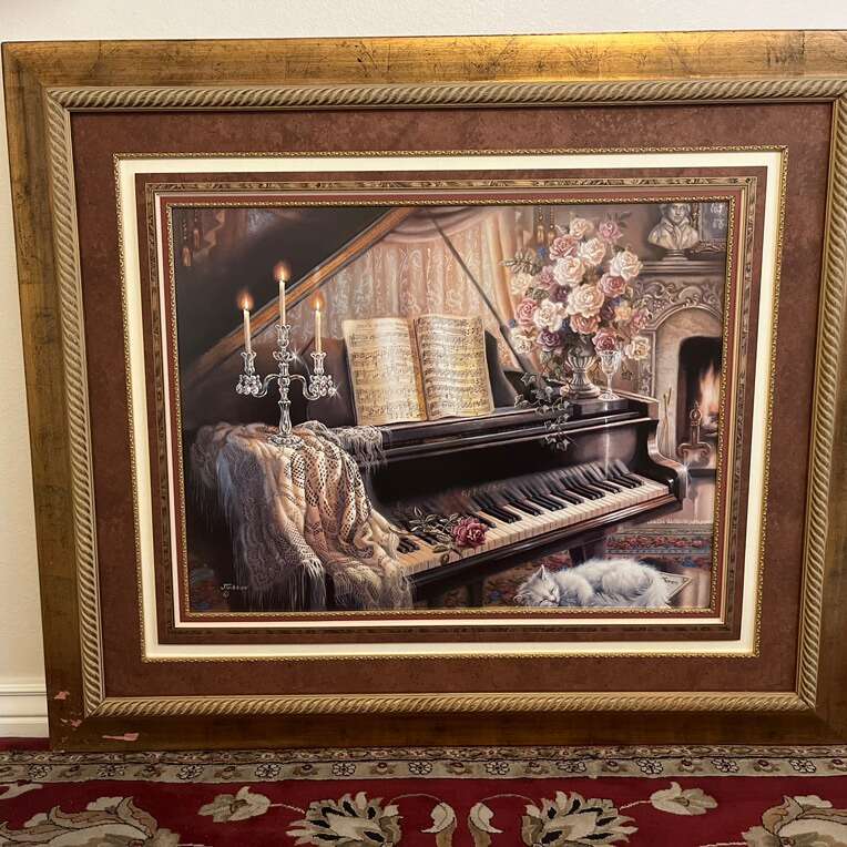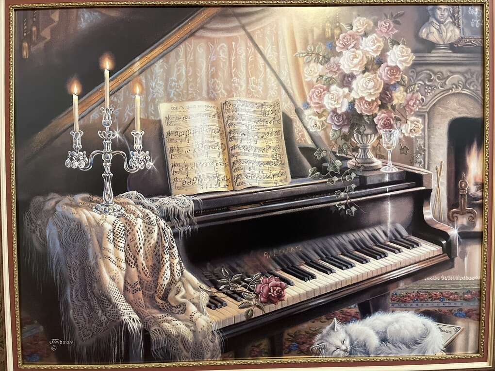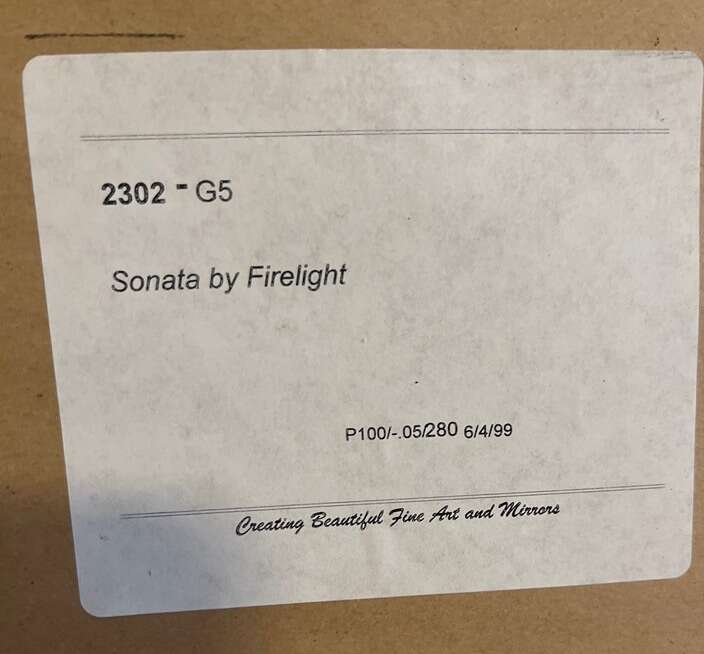 Dimensions are 46“ x 39” x 1 1/2”inches. Sonata by firelight with piano, roses, candlesticks, cat, and shawl. Hardwood frame with triple embroidery, and three set imposed frame, wire hanging. Made by crafting beautiful, fine arts and mirrors P100\– 05\280 Made June 4, 1999 item number 2302 – G5