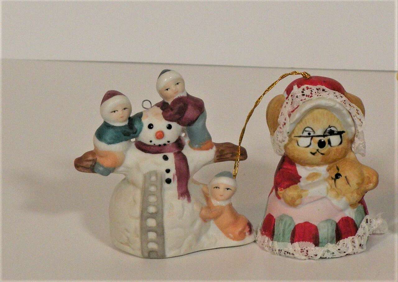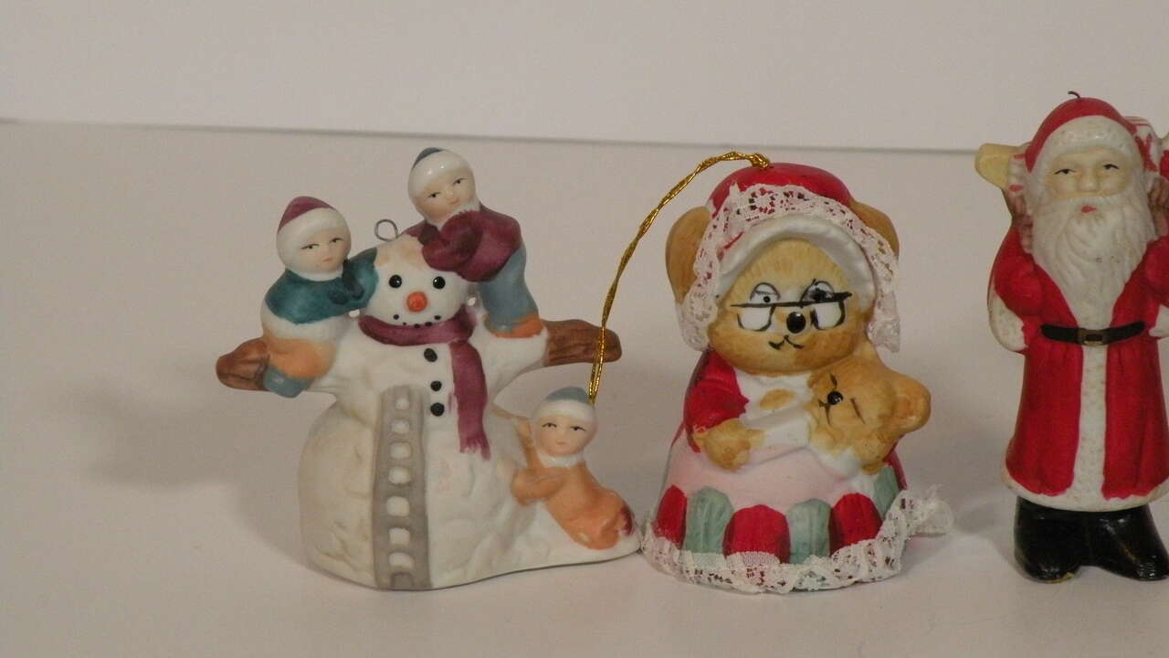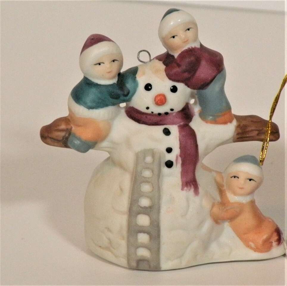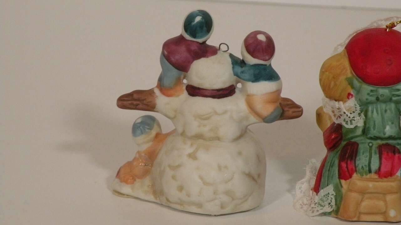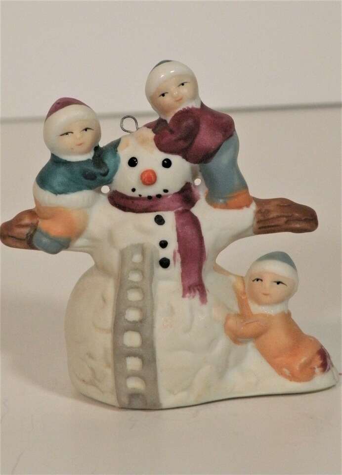 Vintage Assorted Porcelain Ornaments, Santa, Snowmen and Mouse Bell. Vintage ornaments from the 80'S. The mouse is actually a bell by Jasco. The two Santa's are porcelain replicas of the old Santa and carry a brown bag full of presents. The snowman is porcelain and is holding two children and one hanging on below. The hooks are securely attached and are in excellent condition. They are approximately 3 to 3 1/2 inches tall. They are hand painted and each one is uniquely finished. These will add a bit of nostalgia to your tree or display. part of father's collection. He used them in his Christmas Yard display. In good condition. One Santa has broken hook at top but ornament in excellent condition for their age.”