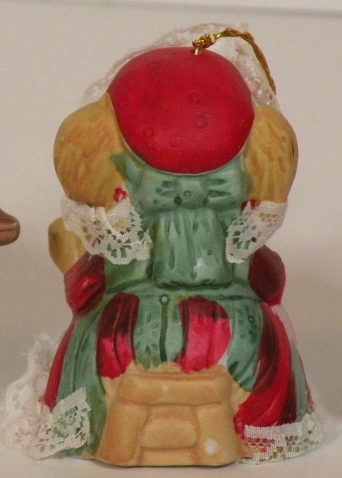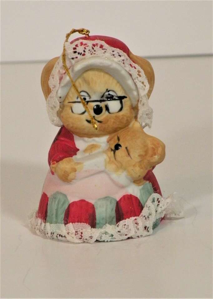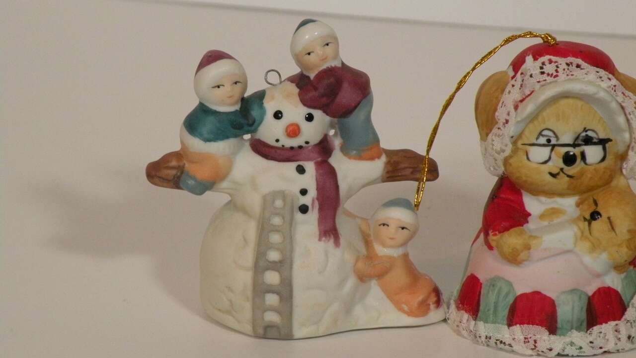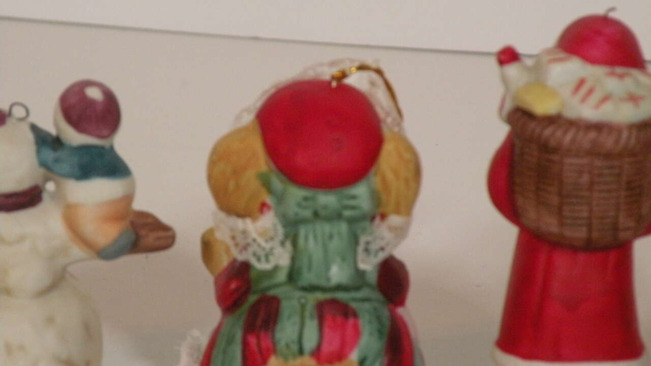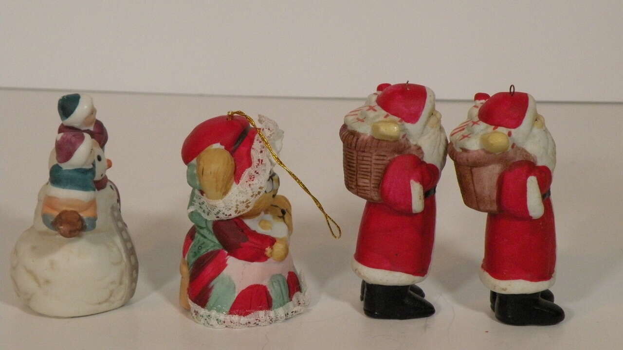 Vintage Assorted Porcelain Ornaments, Santa, Snowmen and Mouse Bell. Vintage ornaments from the 80'S. The mouse is actually a bell by Jasco. The two Santa's are porcelain replicas of the old Santa and carry a brown bag full of presents. The snowman is porcelain and is holding two children and one hanging on below. The hooks are securely attached and are in excellent condition. They are approximately 3 to 3 1/2 inches tall. They are hand painted and each one is uniquely finished. These will add a bit of nostalgia to your tree or display. part of father's collection. He used them in his Christmas Yard display. In good condition. One Santa has broken hook at top but ornament in excellent condition for their age.”