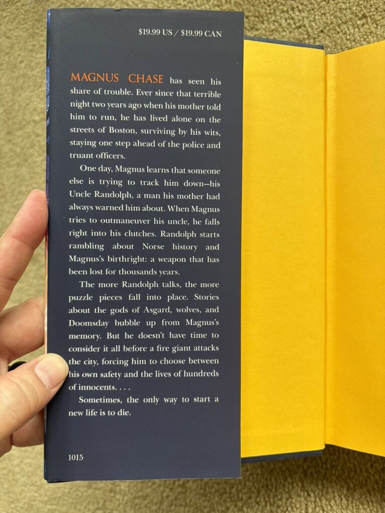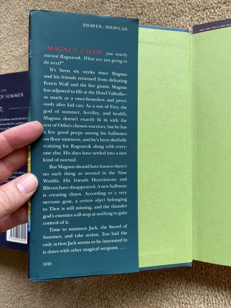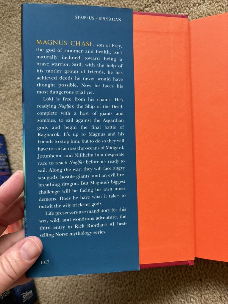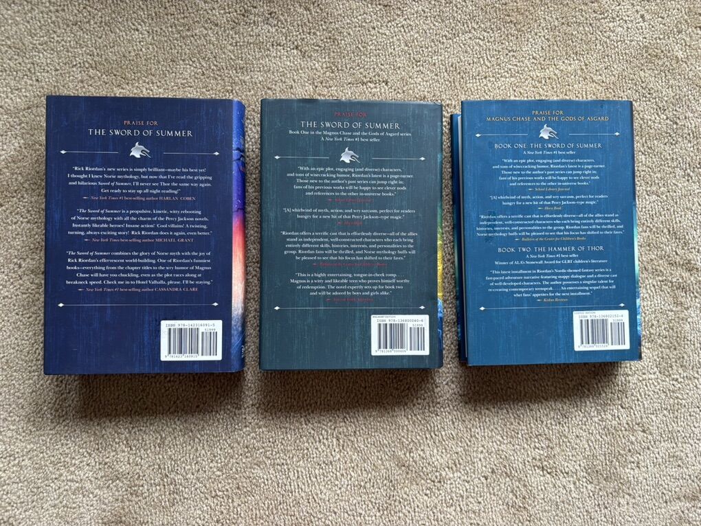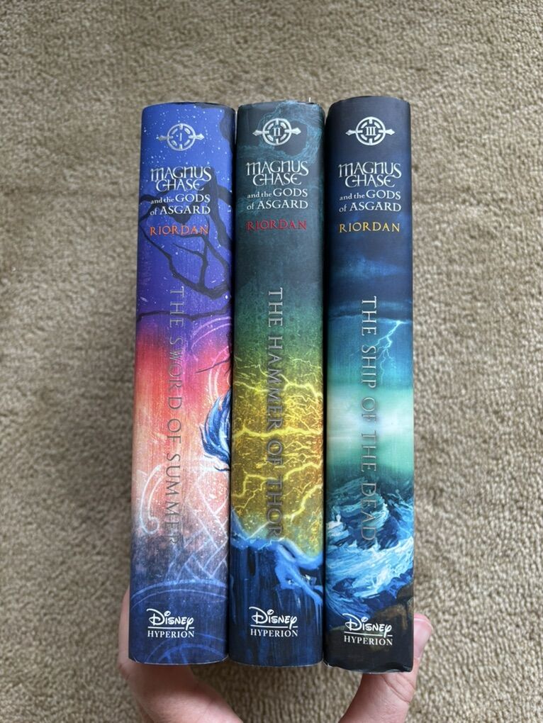 Magnus Chase and the Gods of Asgard Complete Series 1-3, by Rick Riordan: The Sword of Summer (2015, 497 pages), The Hammer of Thor (2016, 465 pages, includes bookmark), and The Ship of the Dead (2017, 417 pages, includes exclusive poster). Disney Hyperion. First edition hardcovers in excellent condition, including dust jackets (a couple of small tears--see photos). Text only. Cash or Venmo.