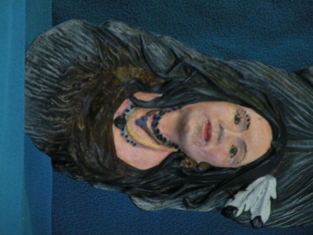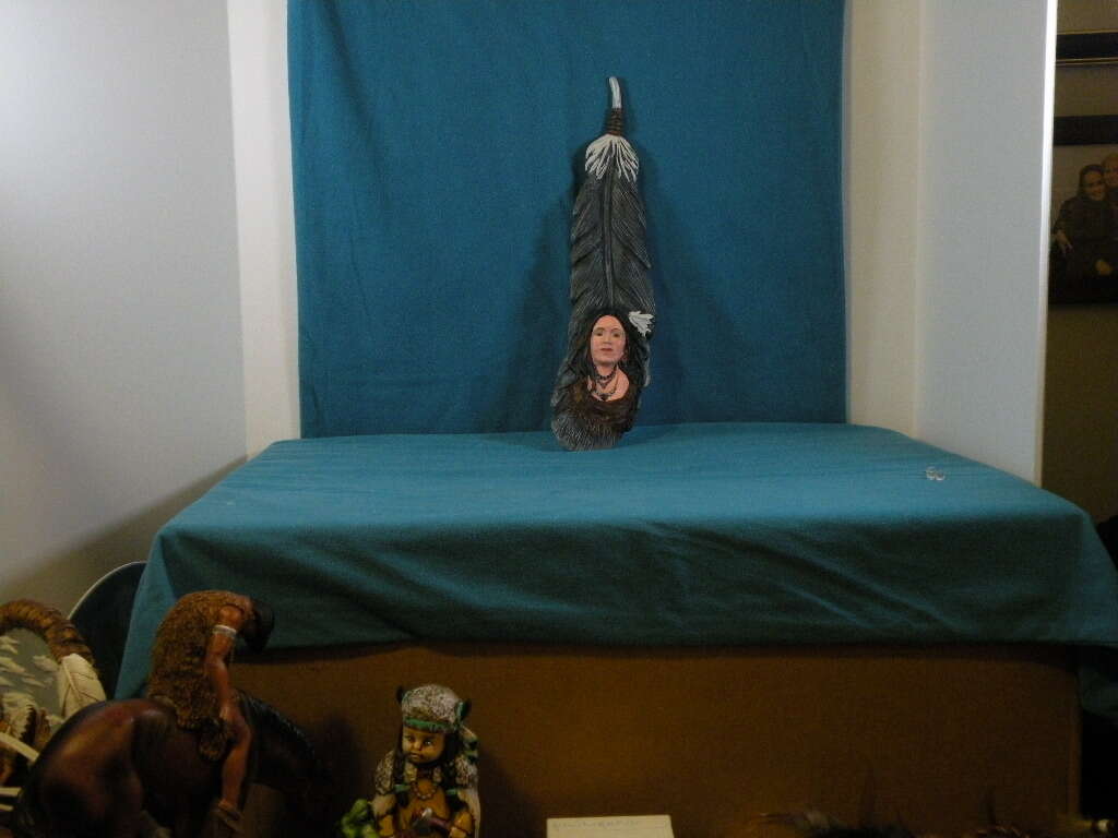 Native American Ceramic Replica of Feather w face of Indian Maiden. Hand painted. This is a ceramic Replica of a Feather that is handpainted and has a handpainted maiden at the bottom of it. Very unique with hole in back for hanging. 131/2 inches.