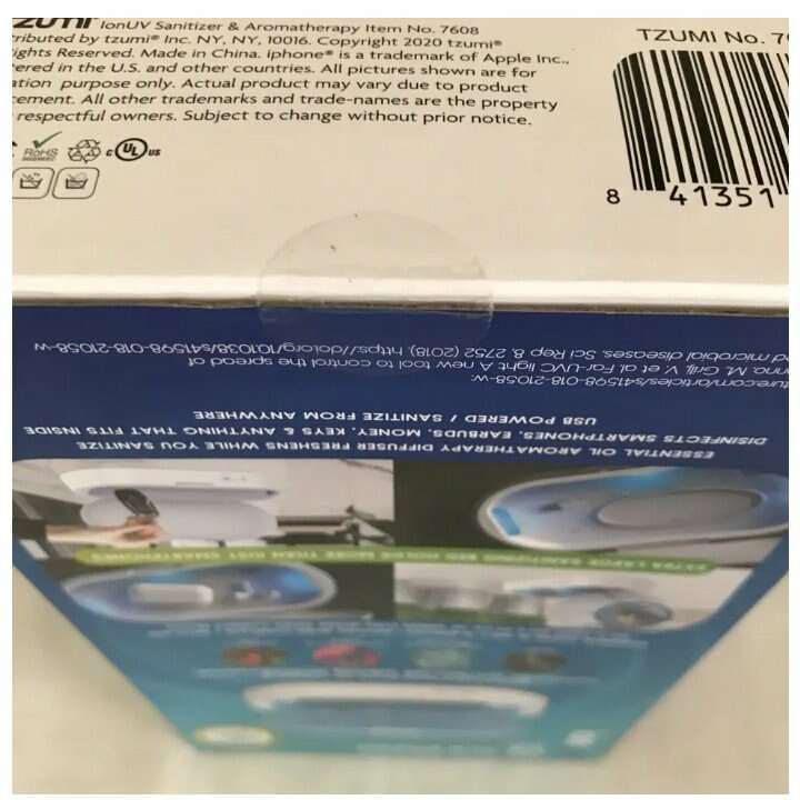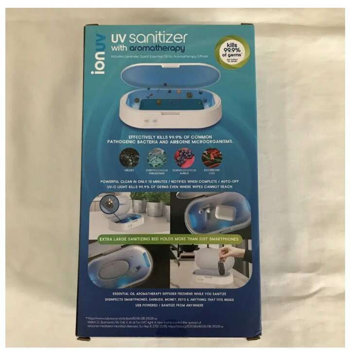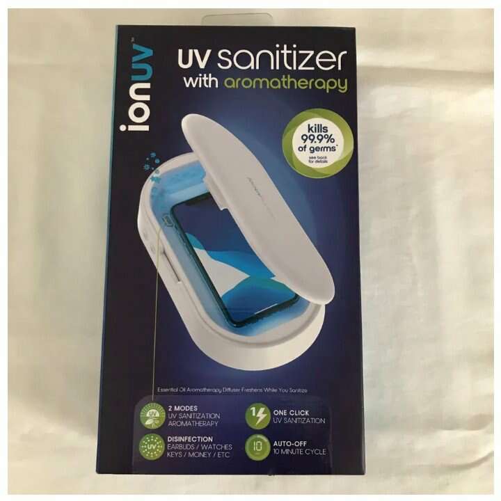 Ionuv by Tzumi UV Sanitizer with Aromatherapy/New/No 7608/10 Min Cycle. Condition is "New in Sealed Box" This is a brand new, in sealed box UV Sanitizer with Aromatherapy. Box states that it kills 99.9% of germs. Can also be used to sanitize earbuds, watches, keys, money and many other things.