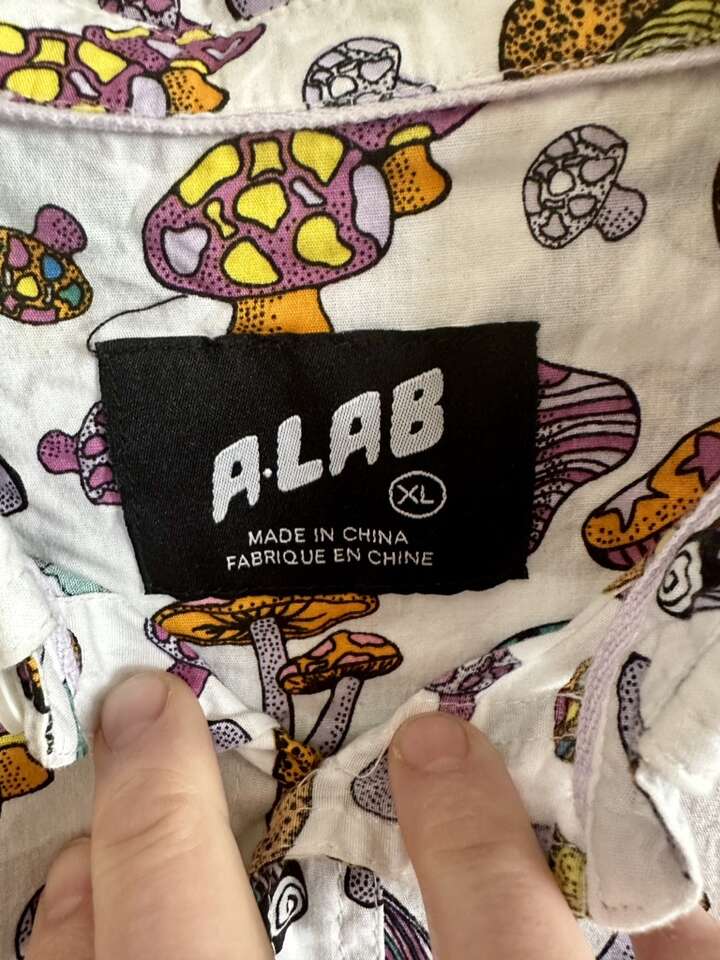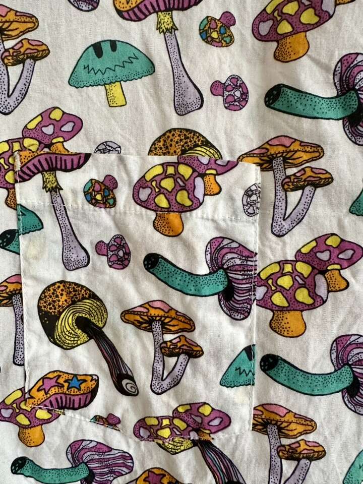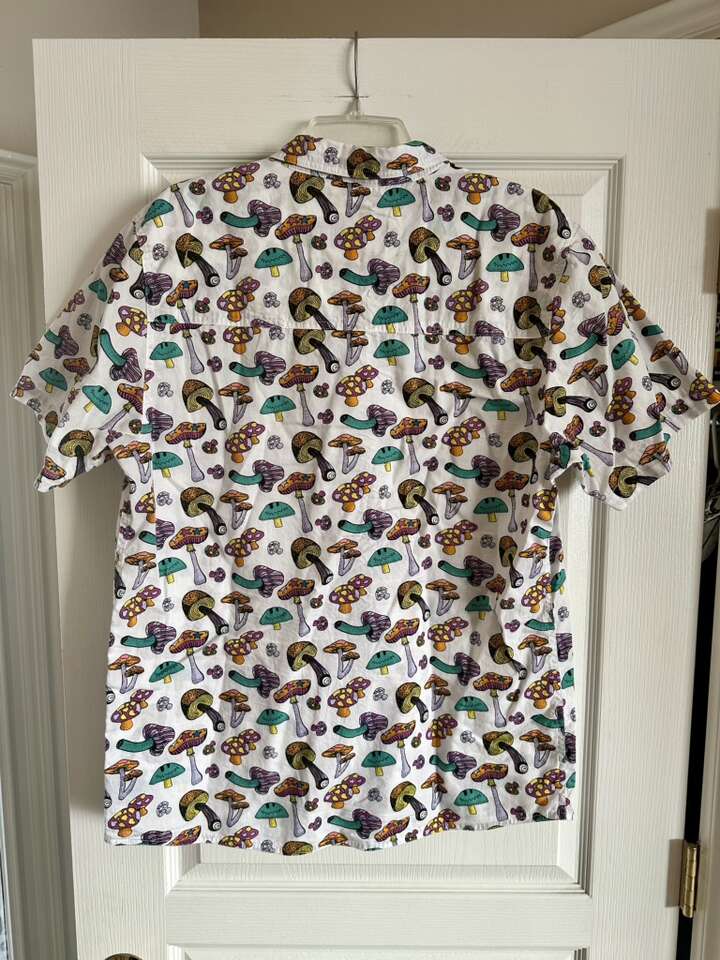Men’s size extra large. Like new condition. Lots of colorful mushrooms pattern. Front chest pocket. Super cool shirt. $20.