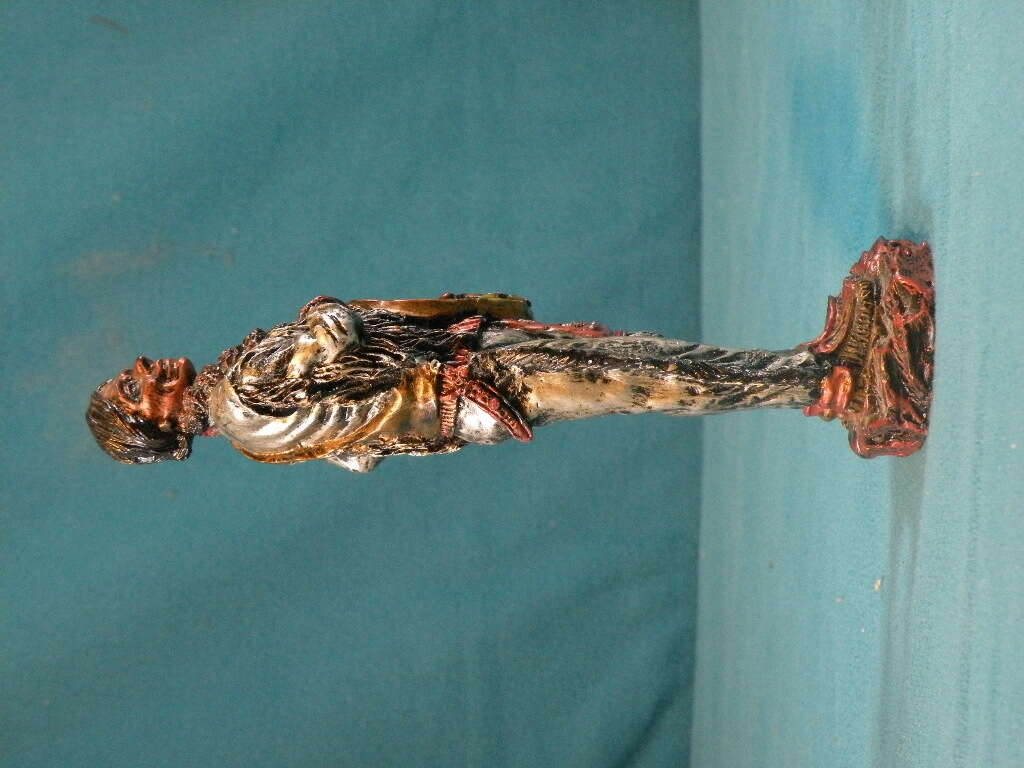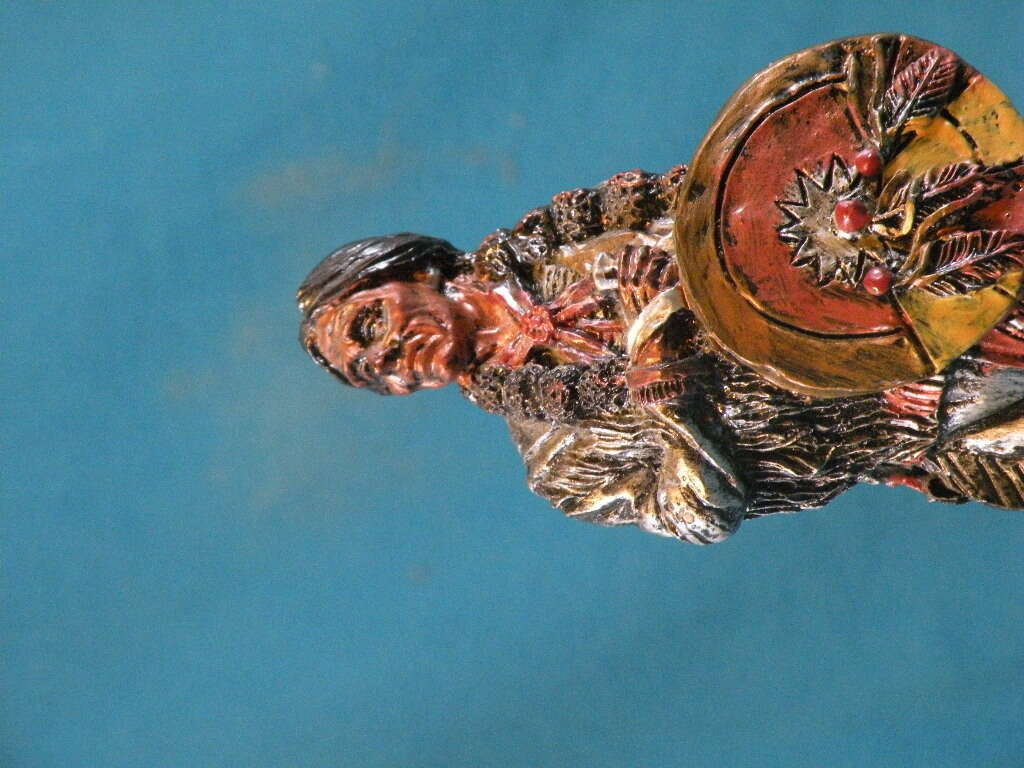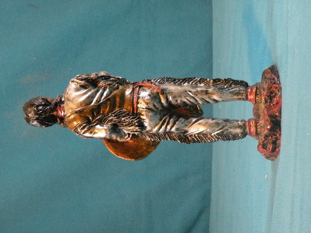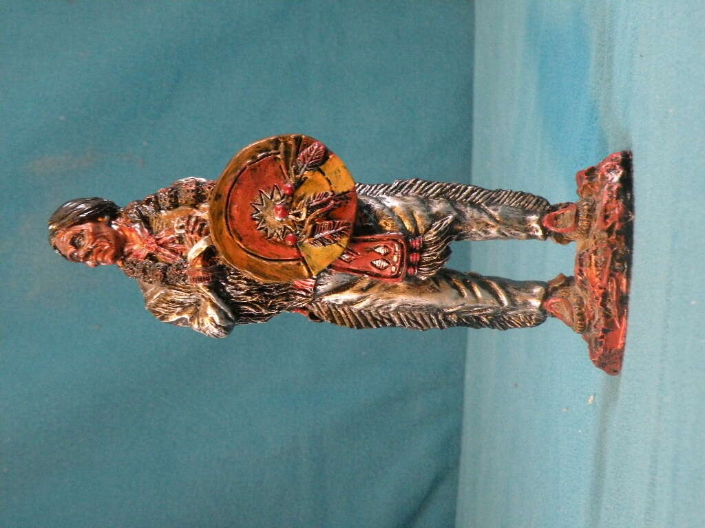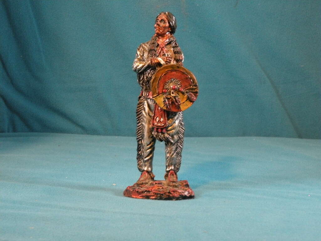 Native American Sculpture Indian Warrior with Shield by Youngs. Unique Indian Warrior handcrafted from looks like metal. The colors are pronounced. He is dressed in Silver. His shield is gold with silver and raisedfeathers. His face is uniquely carved from bronze. The rock is bronze. This is a very hard to find piece and very unique in coloring. In excellent condition. 6 1/2 inches.