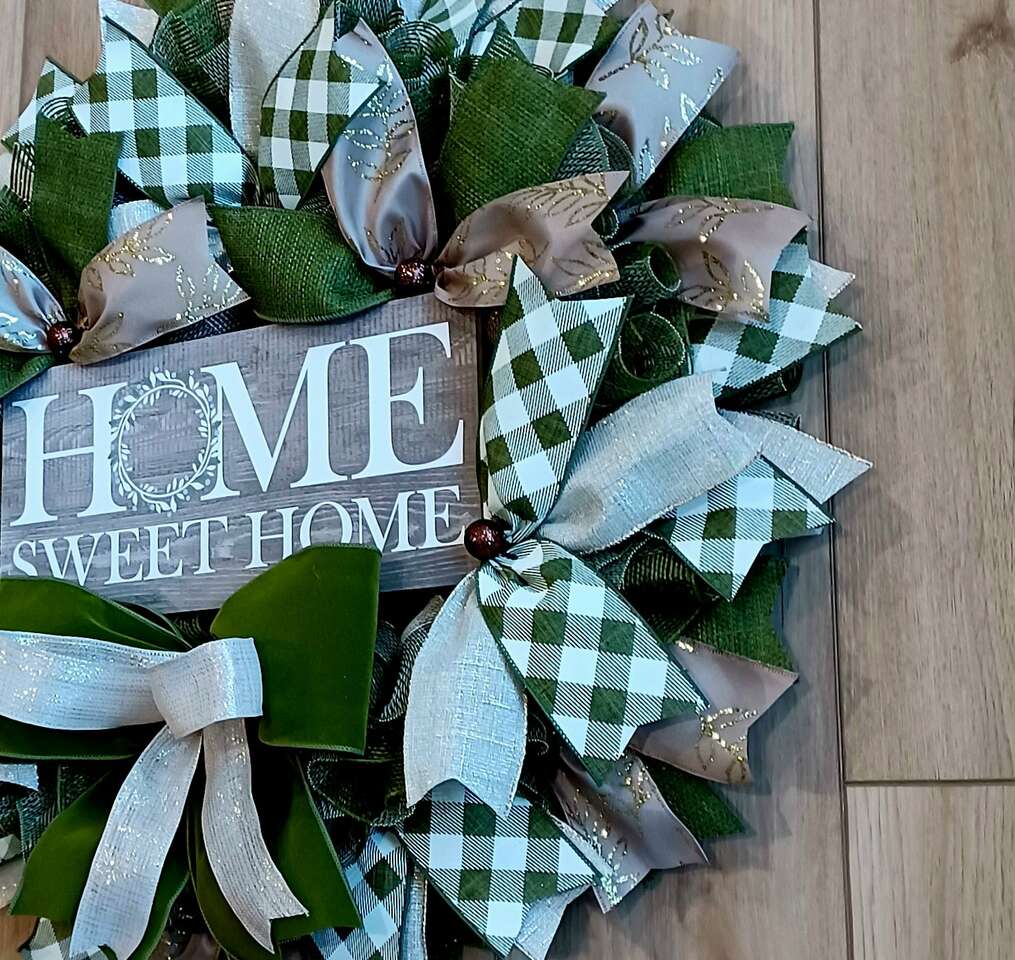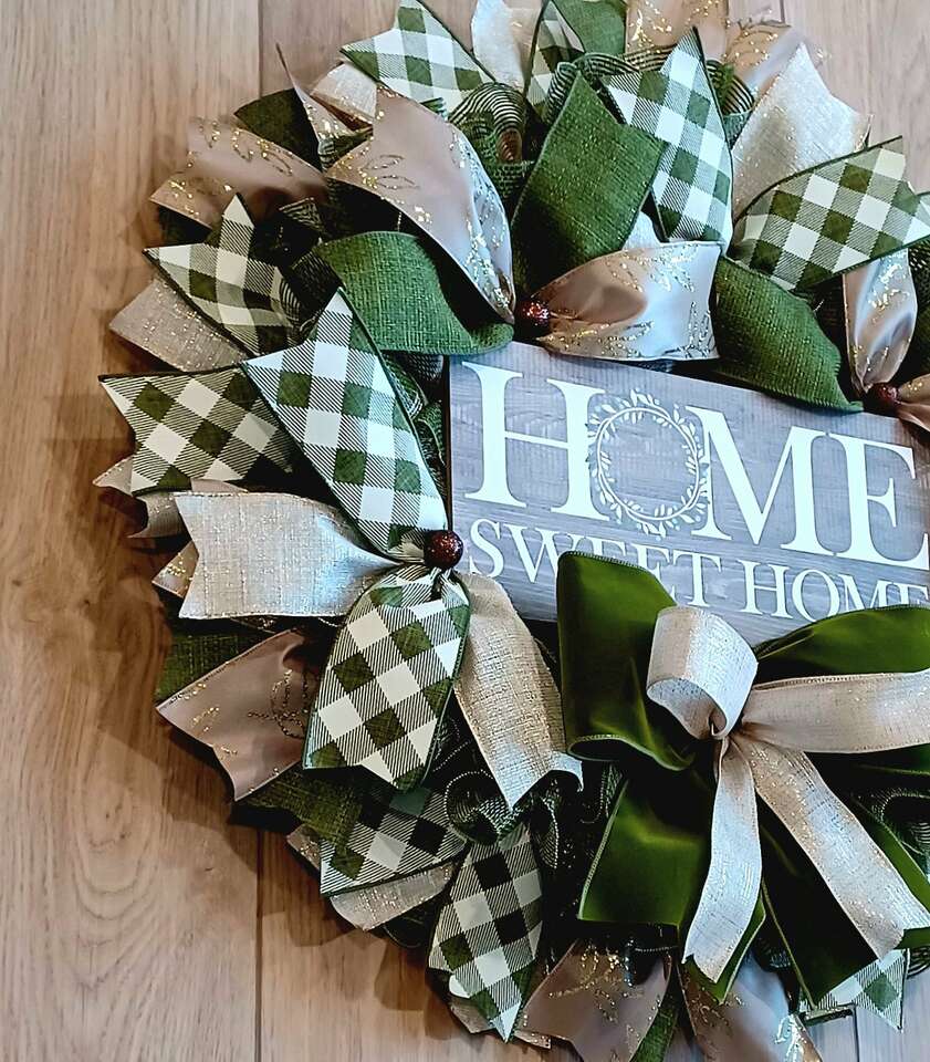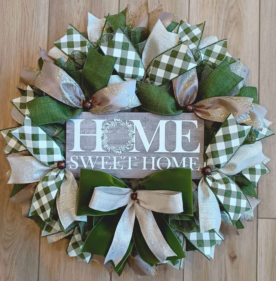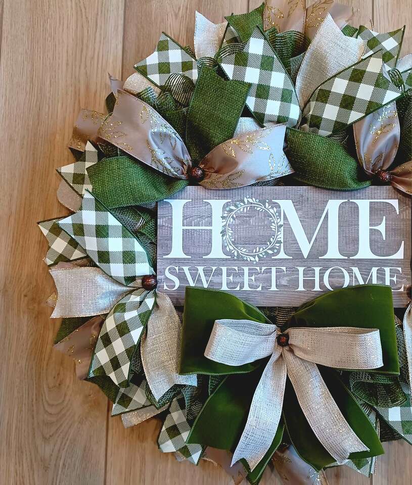 Welcome your family and friends to your home with this everyday handmade 24" wreath for your front door with lots of ribbon and a super cute sign ready for display from a smoke-free pet free home. I can customize and ship. Just ask.